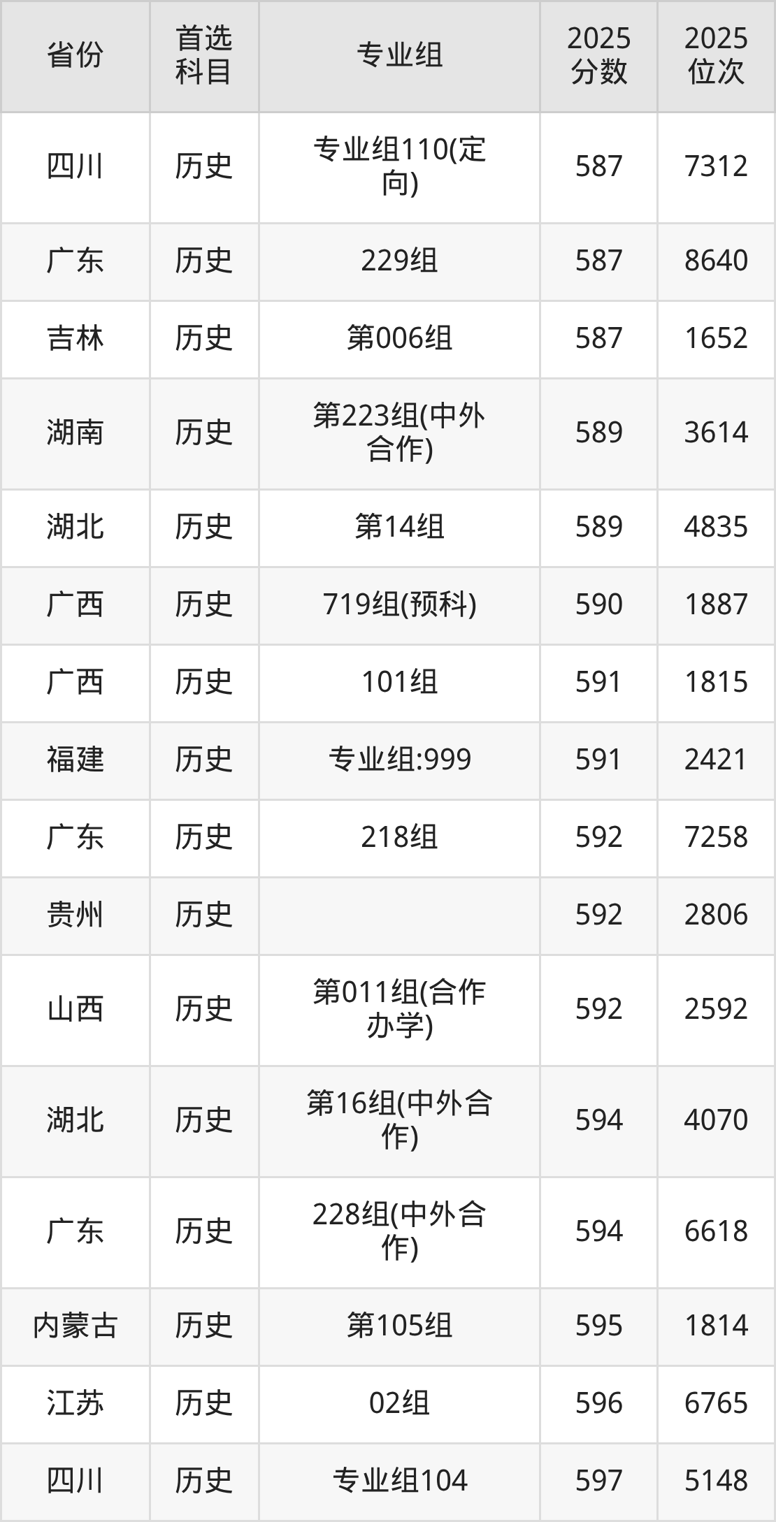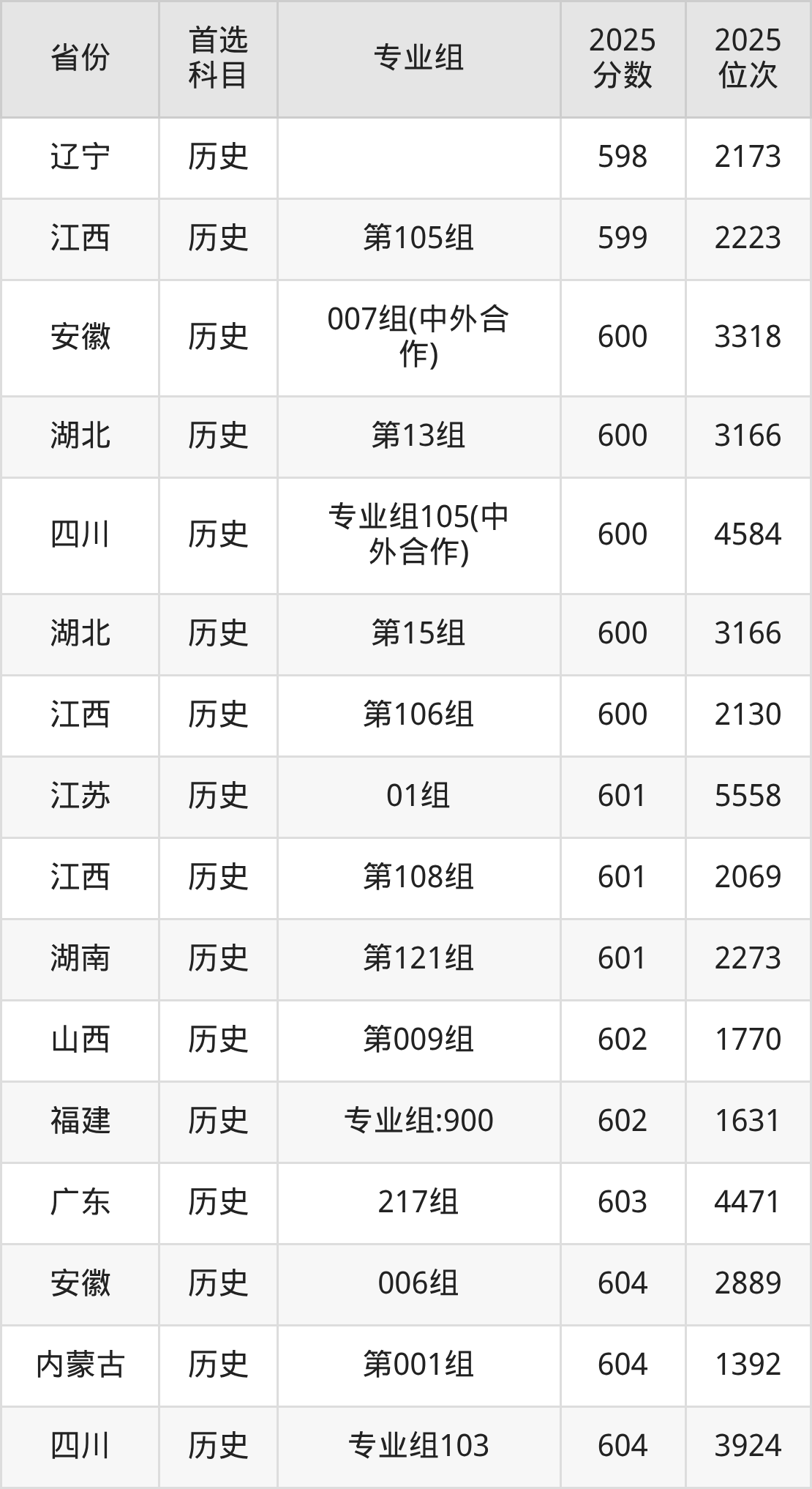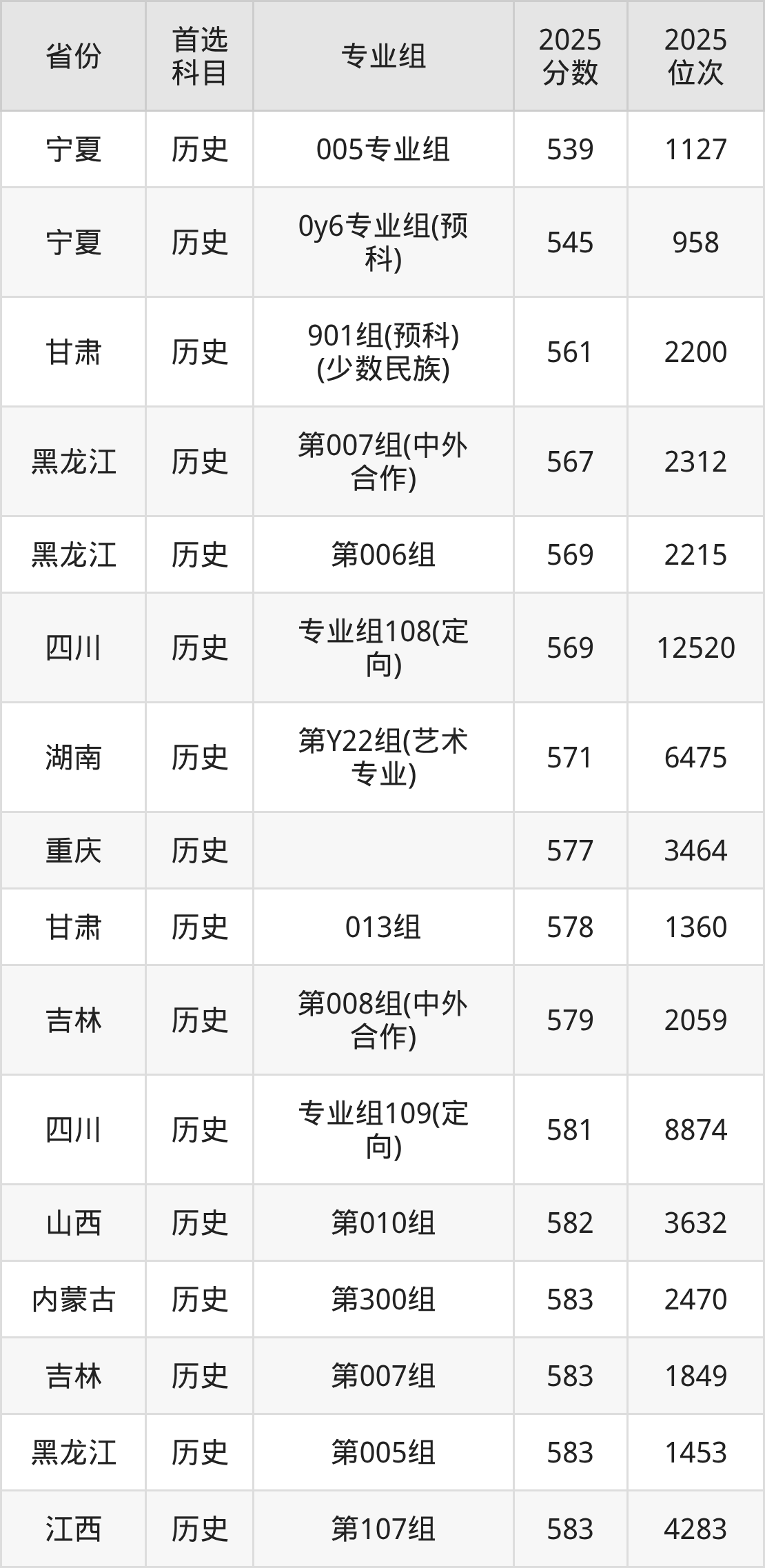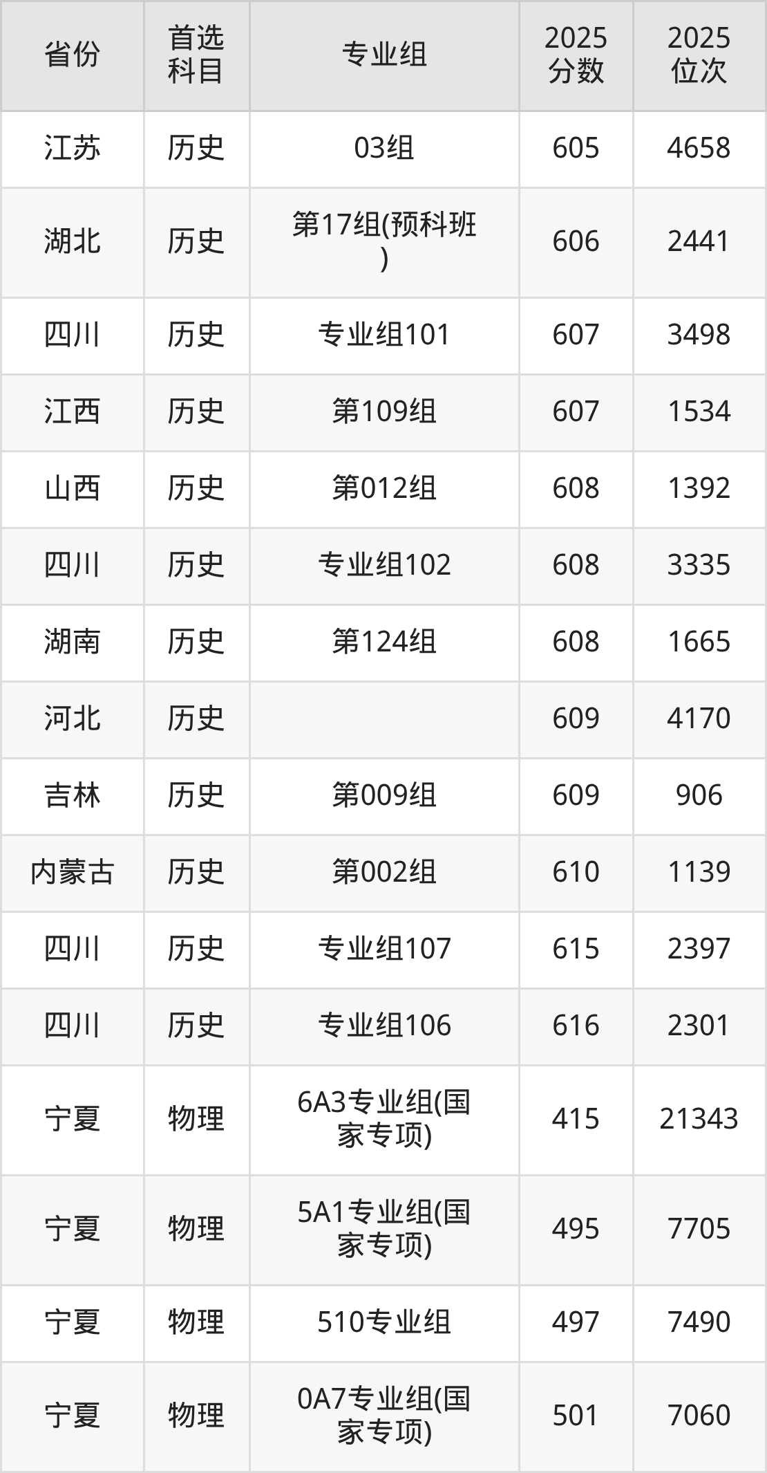 历史类最低分对应地区为宁夏(005专业组),录取位次为1127,超本科B135分;最高分对应地区为四川(专业组106),录取位次为2301,超本科B149分。