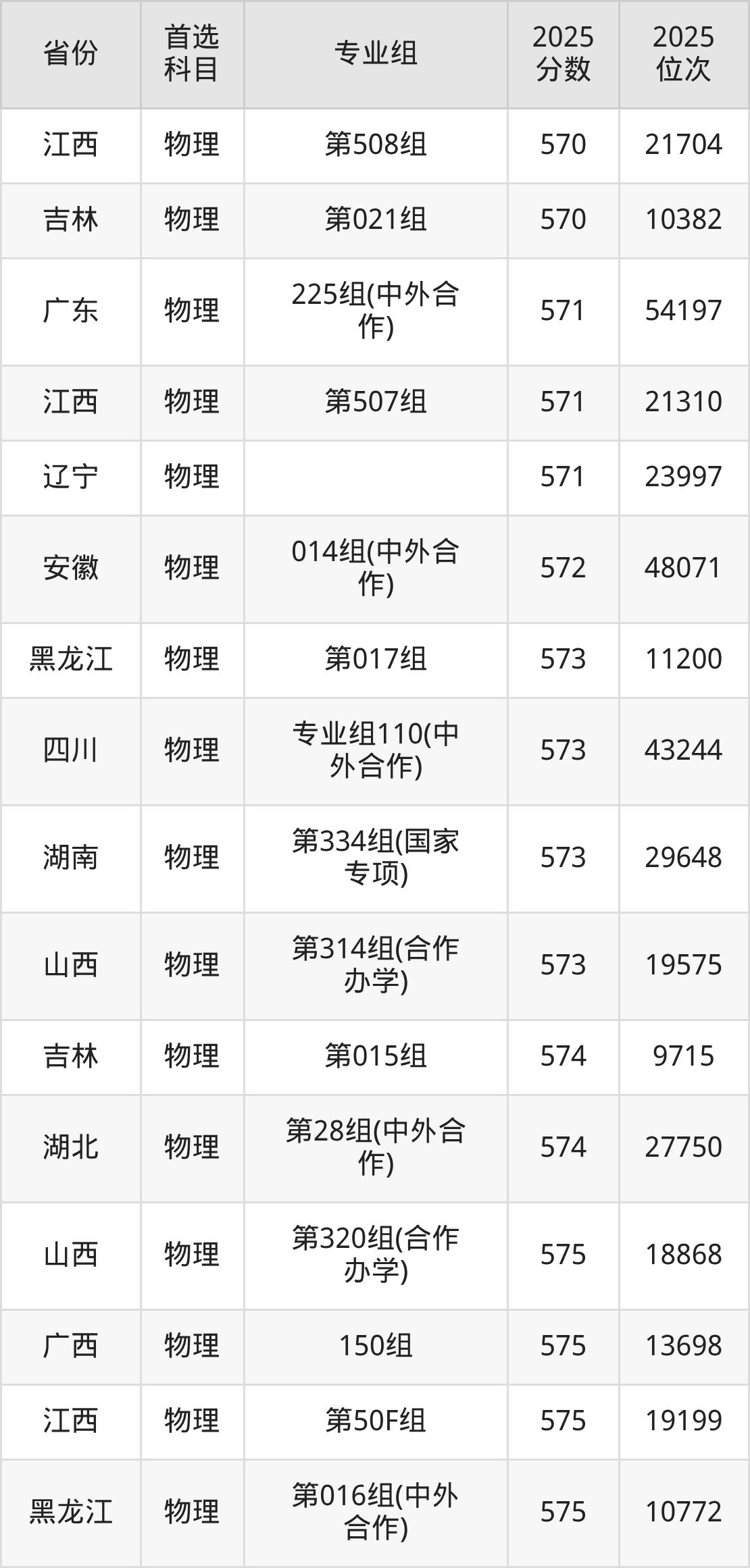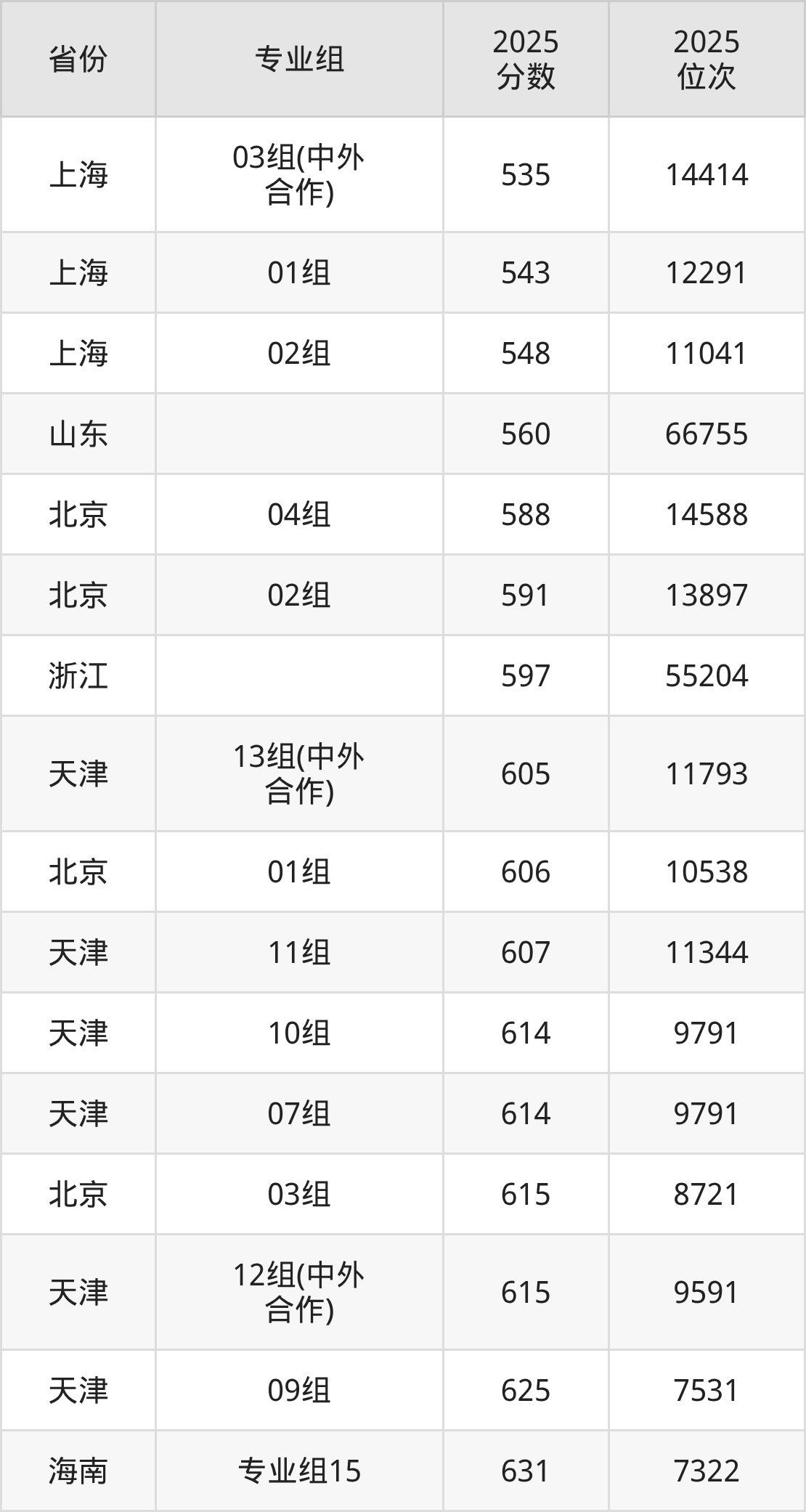 最低分对应地区为上海(03组(中外合作)),录取位次为14414,超本科线133分;最高分对应地区为海南(专业组14),录取位次为3356,超本科线191分。