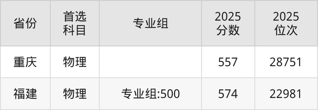 物理类最低分对应地区为重庆,录取位次为28751,超本科线132分;最高分对应地区为福建(专业组:500),录取位次为22981,超本科线133分。