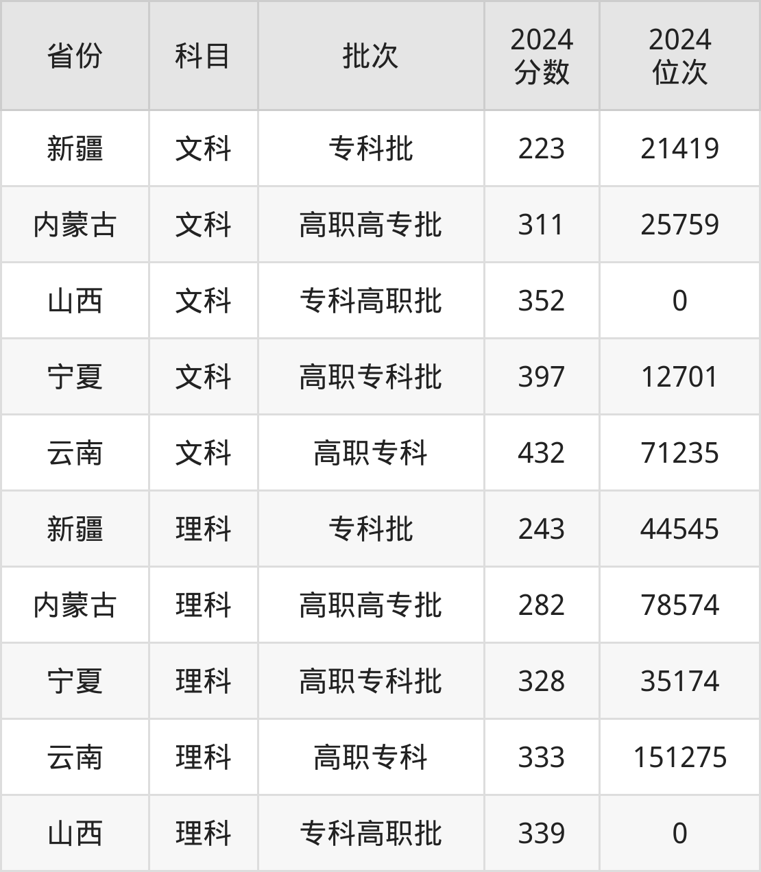 为了方便各地区考生们查看乌兰察布医学高等专科学校的录取情况,本文也整理出2024年乌兰察布医学高等专科学校在全国各省的录取分数线,供参考。
