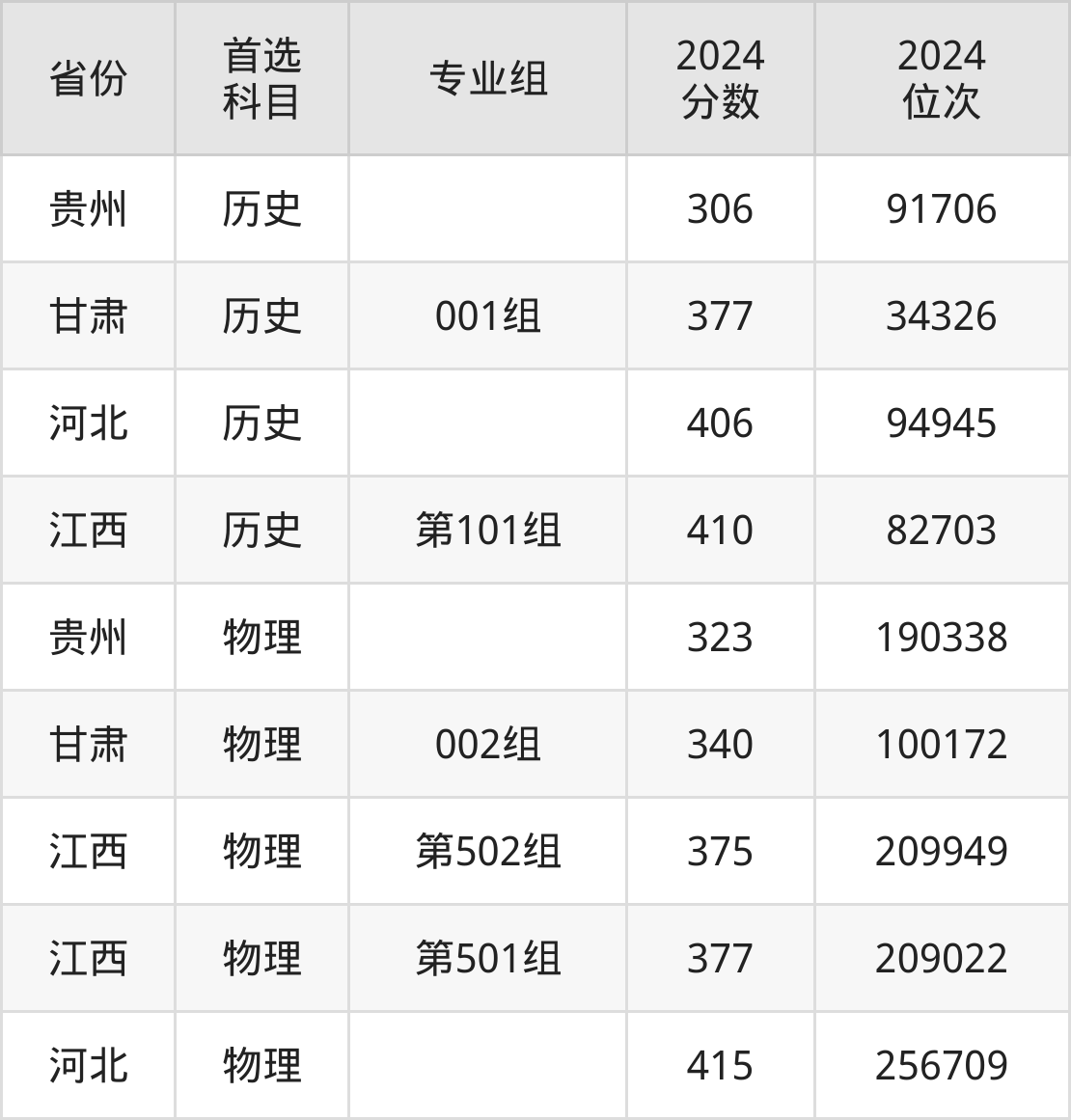 历史类最低分对应地区为贵州,录取位次为91706,超专科线126分;最高分对应地区为江西(第101组),录取位次为82703,超专科线140分。