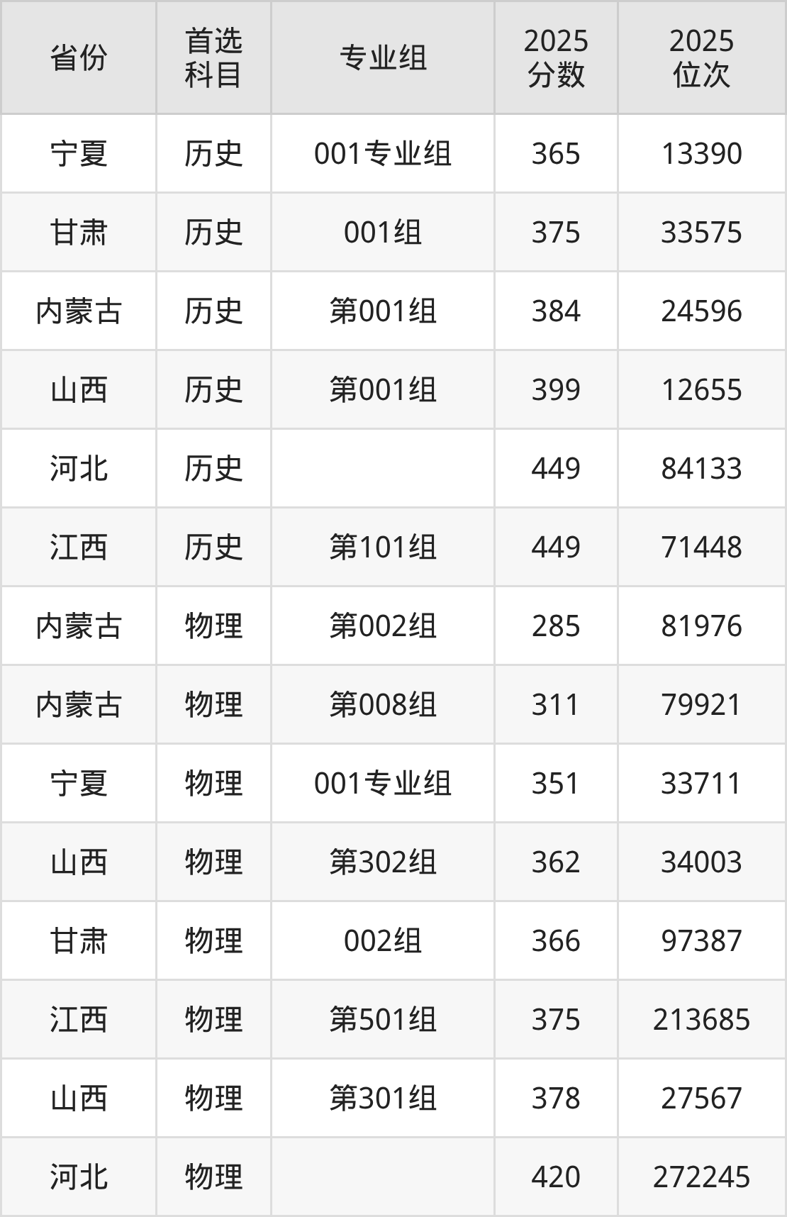 历史类最低分对应地区为宁夏(001专业组),录取位次为13390,超专科线215分;最高分对应地区为江西(第101组),录取位次为71448,超专科线159分。