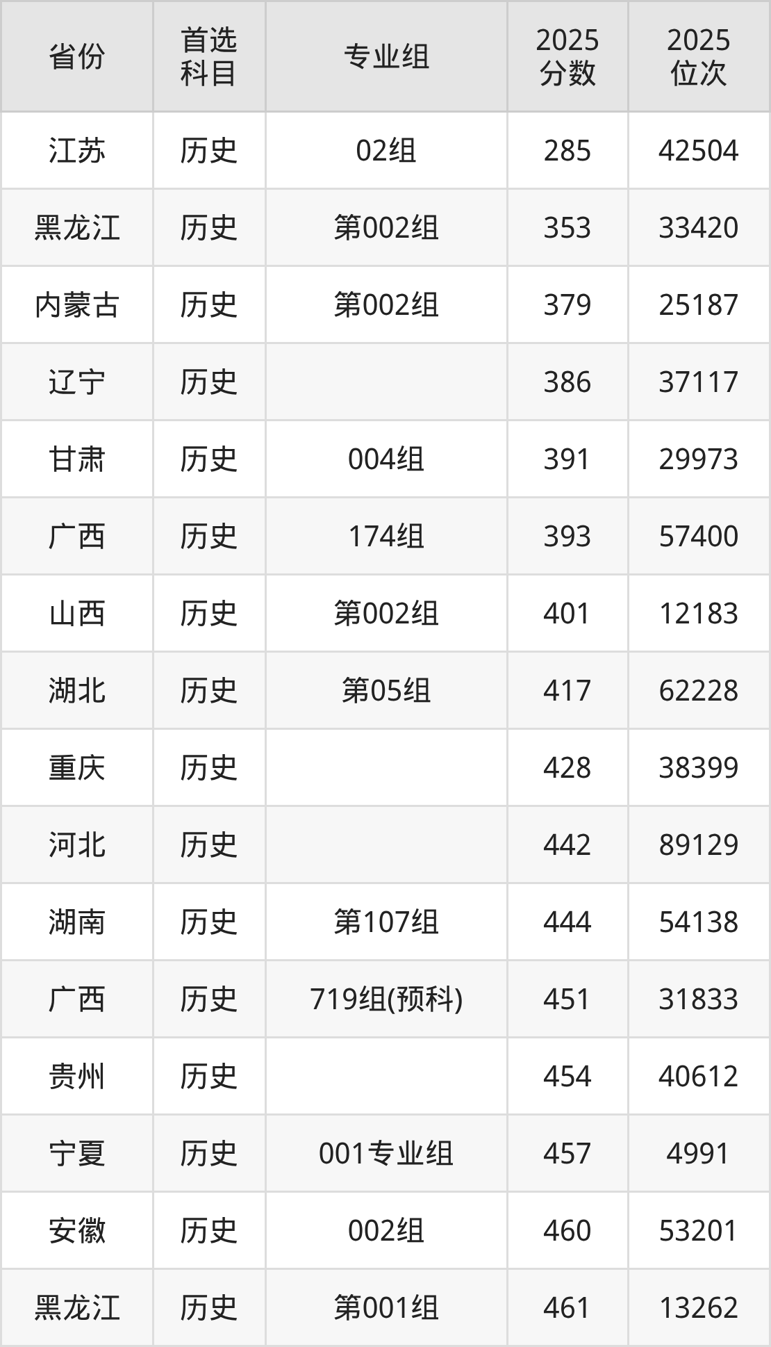 历史类:111组468分、25292名,173组388分、58890名,182组451分、30878名,511组(国家专项计划)412分、46658名,512组(地方专项计划)487分、19519名,719组(预科)453分、30259名;