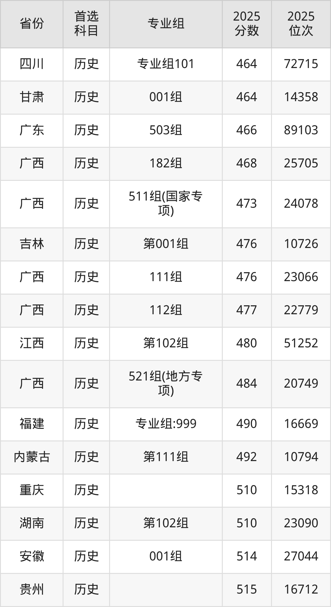 历史类:111组476分、23066名,112组477分、22779名,174组393分、57400名,182组468分、25705名,511组(国家专项)473分、24078名,521组(地方专项)484分、20749名,719组(预科)451分、31833名;