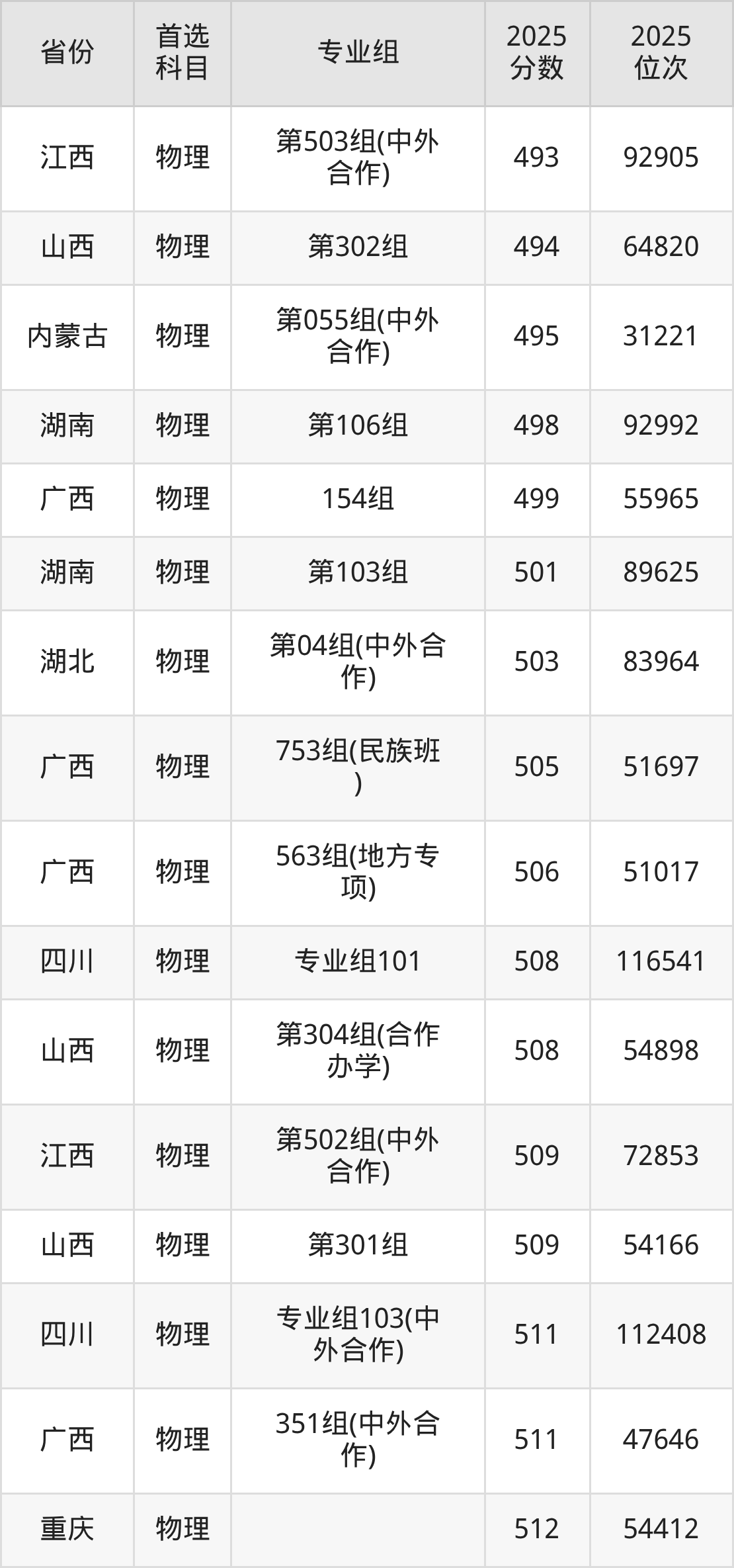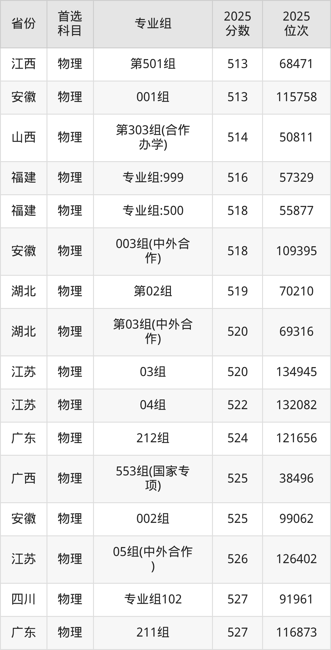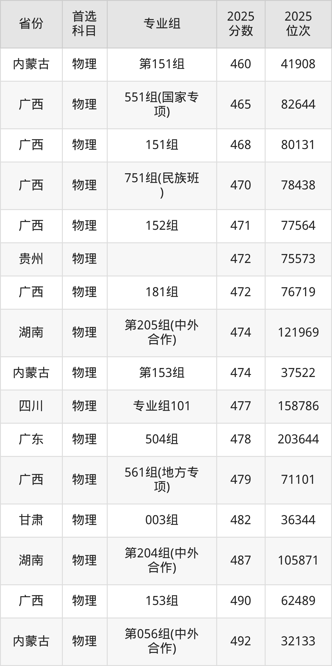 物理类:151组468分、80131名,152组471分、77564名,153组490分、62489名,154组499分、55965名,171组380分、164549名,172组377分、167582名,173组355分、188429名,181组472分、76719名,351组(中外合作)511分、47646名,352组(中外合作)453分、92969名,551组(国家专项)465分、82644名,553组(国家专项)525分、38496名,561组(地方专项)479分、71101名,563组(地方专项)506分、51017名,751组(民族班)470分、78438名,753组(民族班)505分、51697名,759组(预科)459分、87740名;