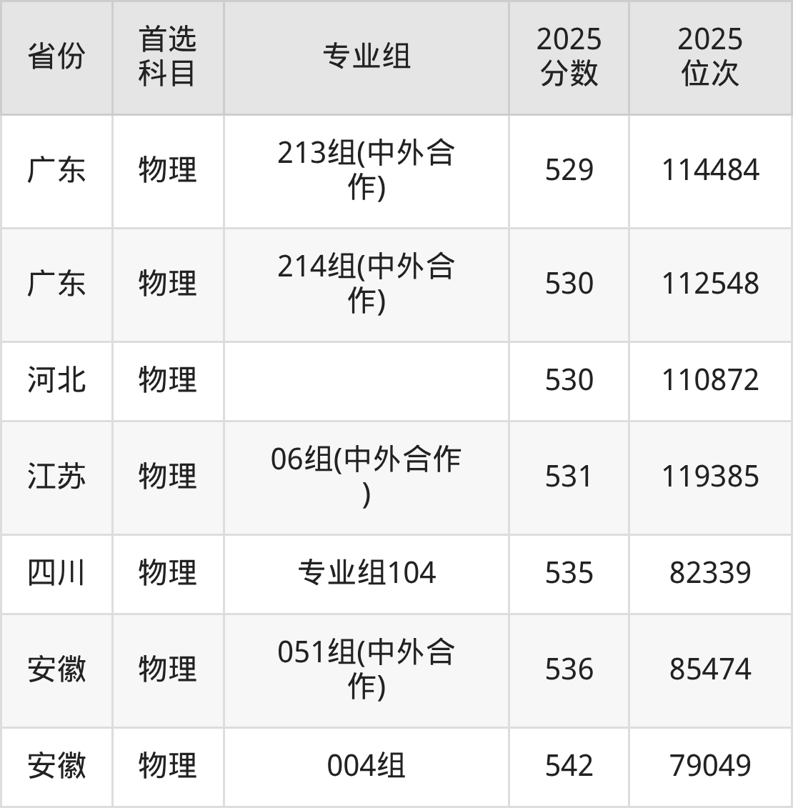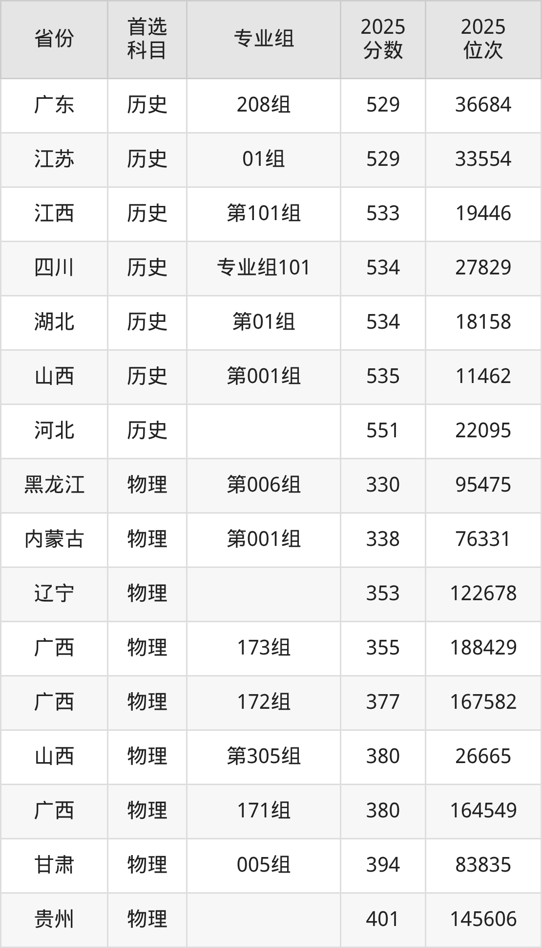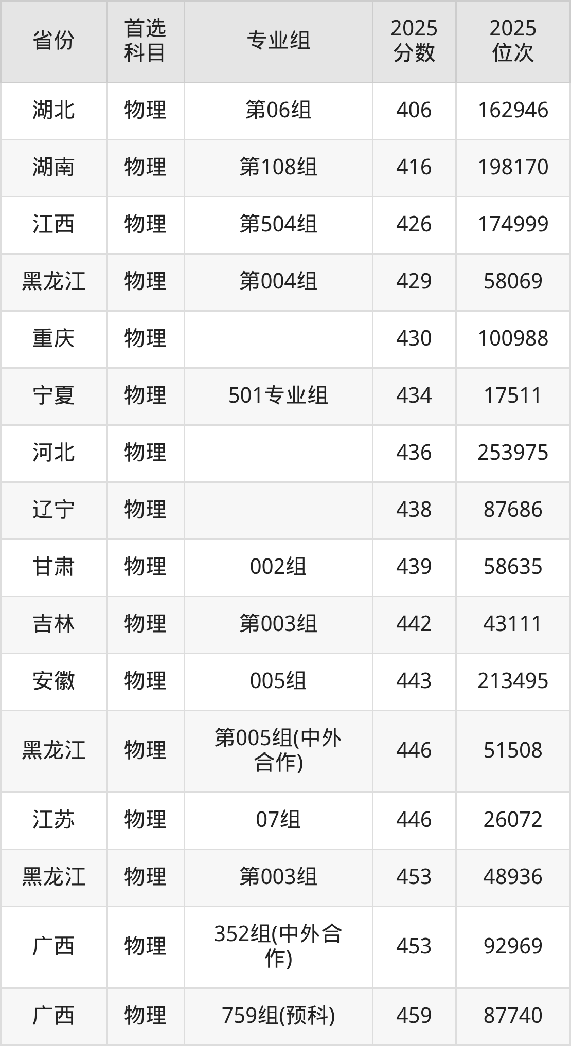 物理类:151组468分、80131名,152组471分、77564名,153组490分、62489名,154组499分、55965名,171组380分、164549名,172组377分、167582名,173组355分、188429名,181组472分、76719名,351组(中外合作)511分、47646名,352组(中外合作)453分、92969名,551组(国家专项)465分、82644名,553组(国家专项)525分、38496名,561组(地方专项)479分、71101名,563组(地方专项)506分、51017名,751组(民族班)470分、78438名,753组(民族班)505分、51697名,759组(预科)459分、87740名;