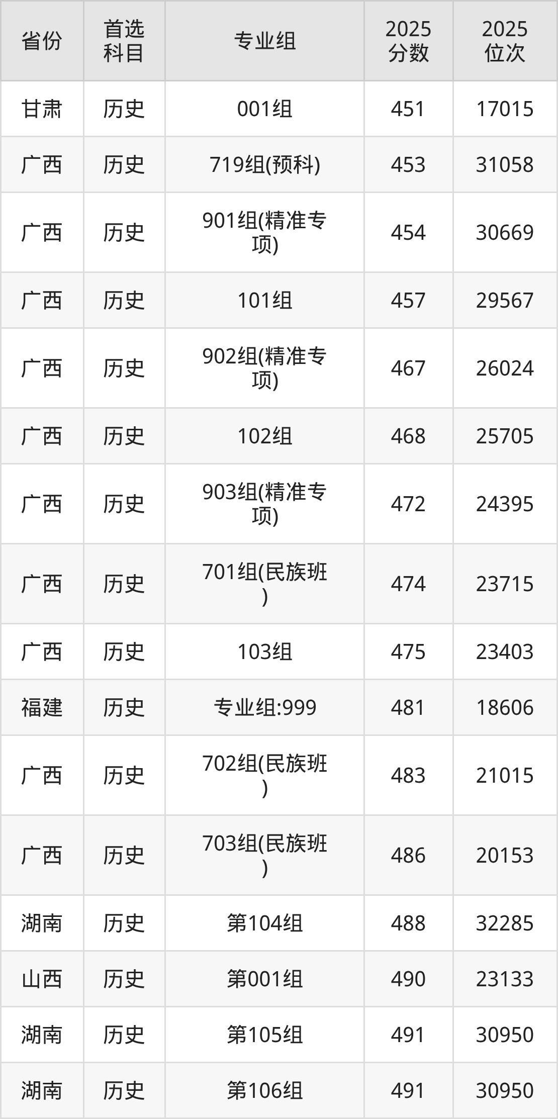 历史类:101组457分、29567名,102组468分、25705名,103组475分、23403名,701组(民族班)474分、23715名,702组(民族班)483分、21015名,703组(民族班)486分、20153名,719组(预科)453分、31058名,901组(精准专项)454分、30669名,902组(精准专项)467分、26024名,903组(精准专项)472分、24395名;