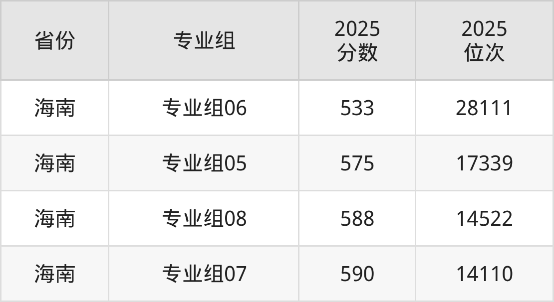 最低分对应地区为海南(专业组06),录取位次为28111,超本科线53分;最高分对应地区为海南(专业组07),录取位次为14110。