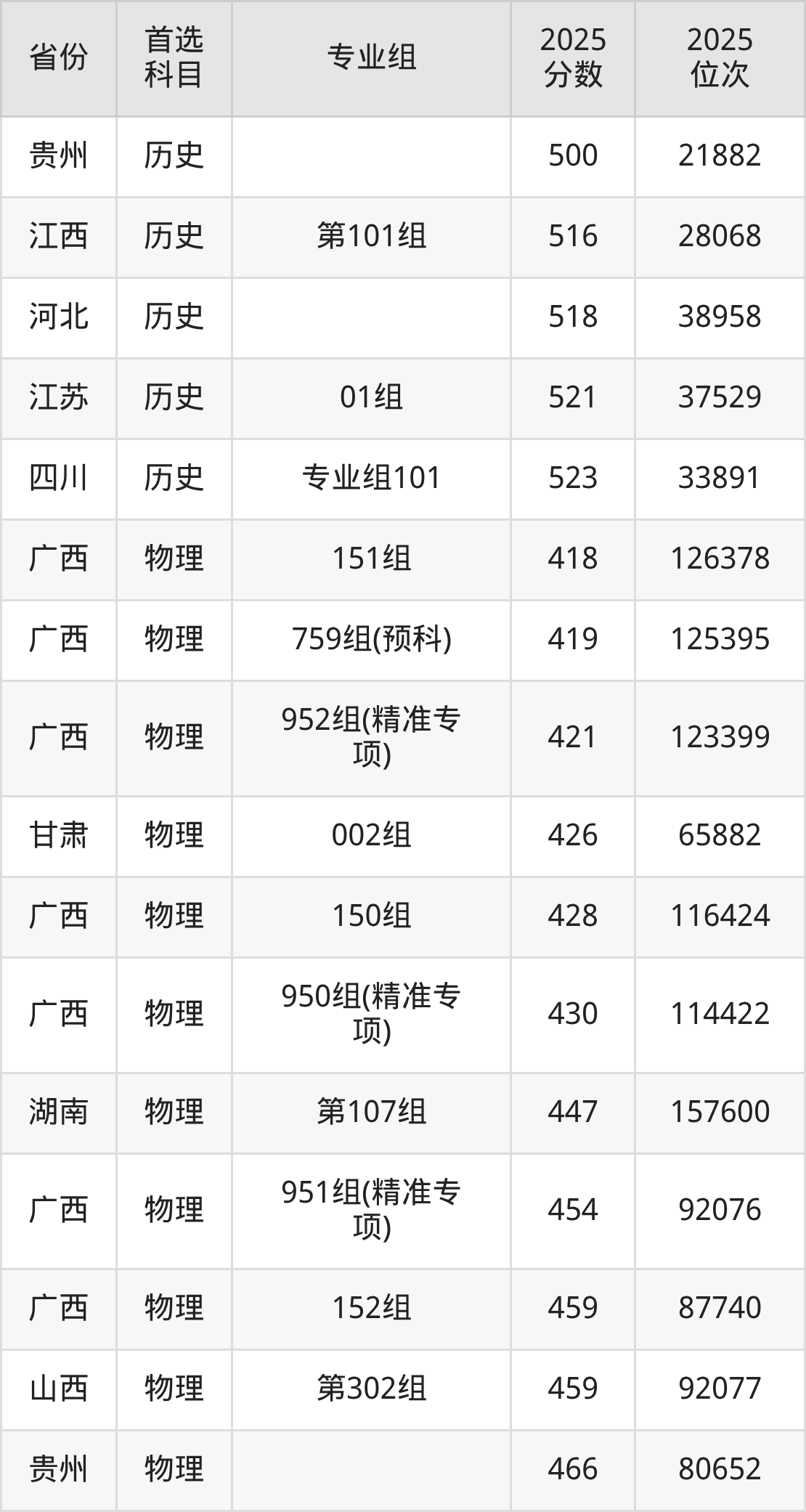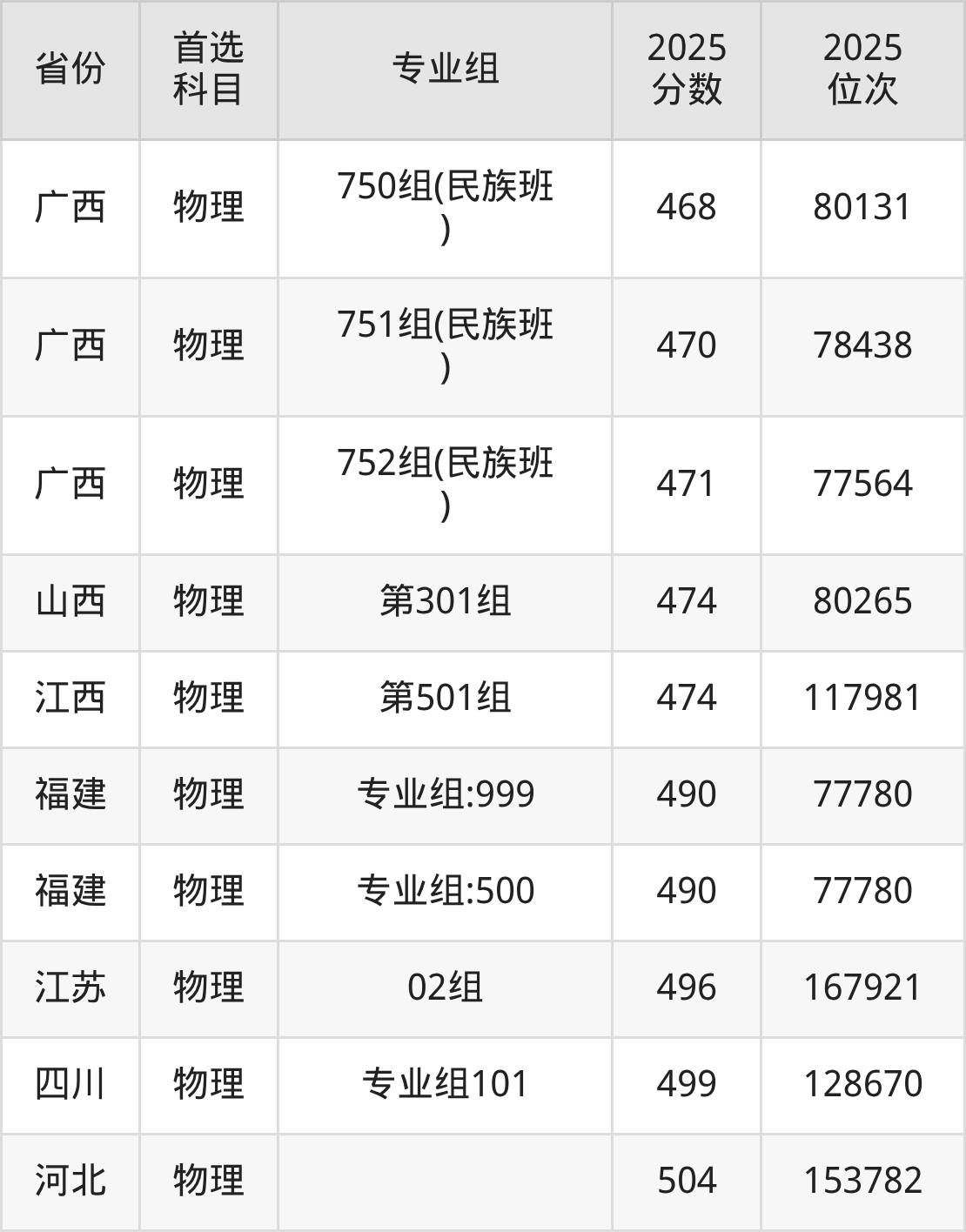 物理类:150组428分、116424名,151组418分、126378名,152组459分、87740名,750组(民族班)468分、80131名,751组(民族班)470分、78438名,752组(民族班)471分、77564名,759组(预科)419分、125395名,950组(精准专项)430分、114422名,951组(精准专项)454分、92076名,952组(精准专项)421分、123399名;