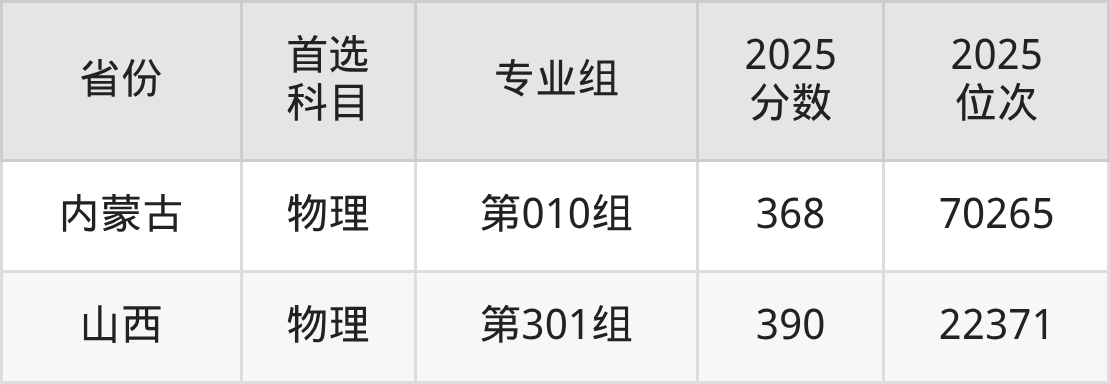 物理类最低分对应地区为内蒙古(第012组),录取位次为78858,超专科线161分;最高分对应地区为山西(第301组),录取位次为22371。