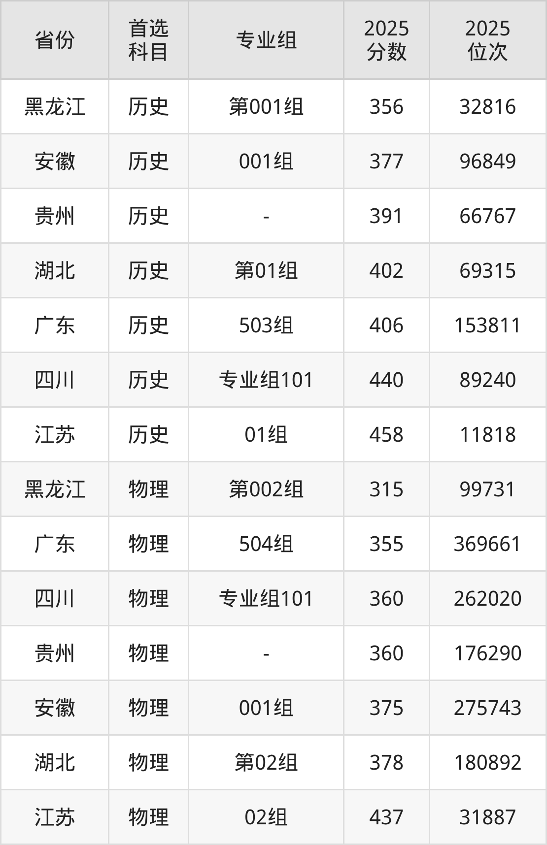历史类最低分对应地区为黑龙江(第001组),录取位次为32816,超专科线196分;最高分对应地区为江苏(01组),录取位次为11818,超专科线238分。