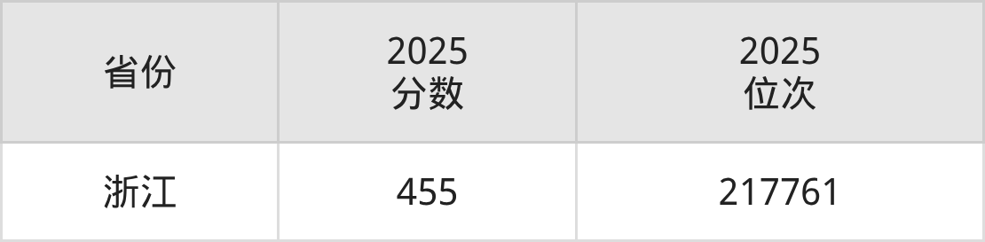 最低分对应地区为浙江,录取位次为217761,超二段线187分。