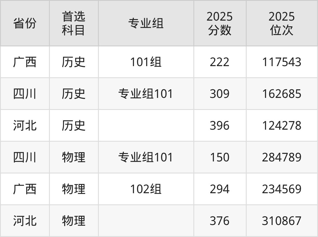 历史类最低分对应地区为广西(101组),录取位次为117543,超专科线22分;最高分对应地区为河北,录取位次为124278,超专科线196分。