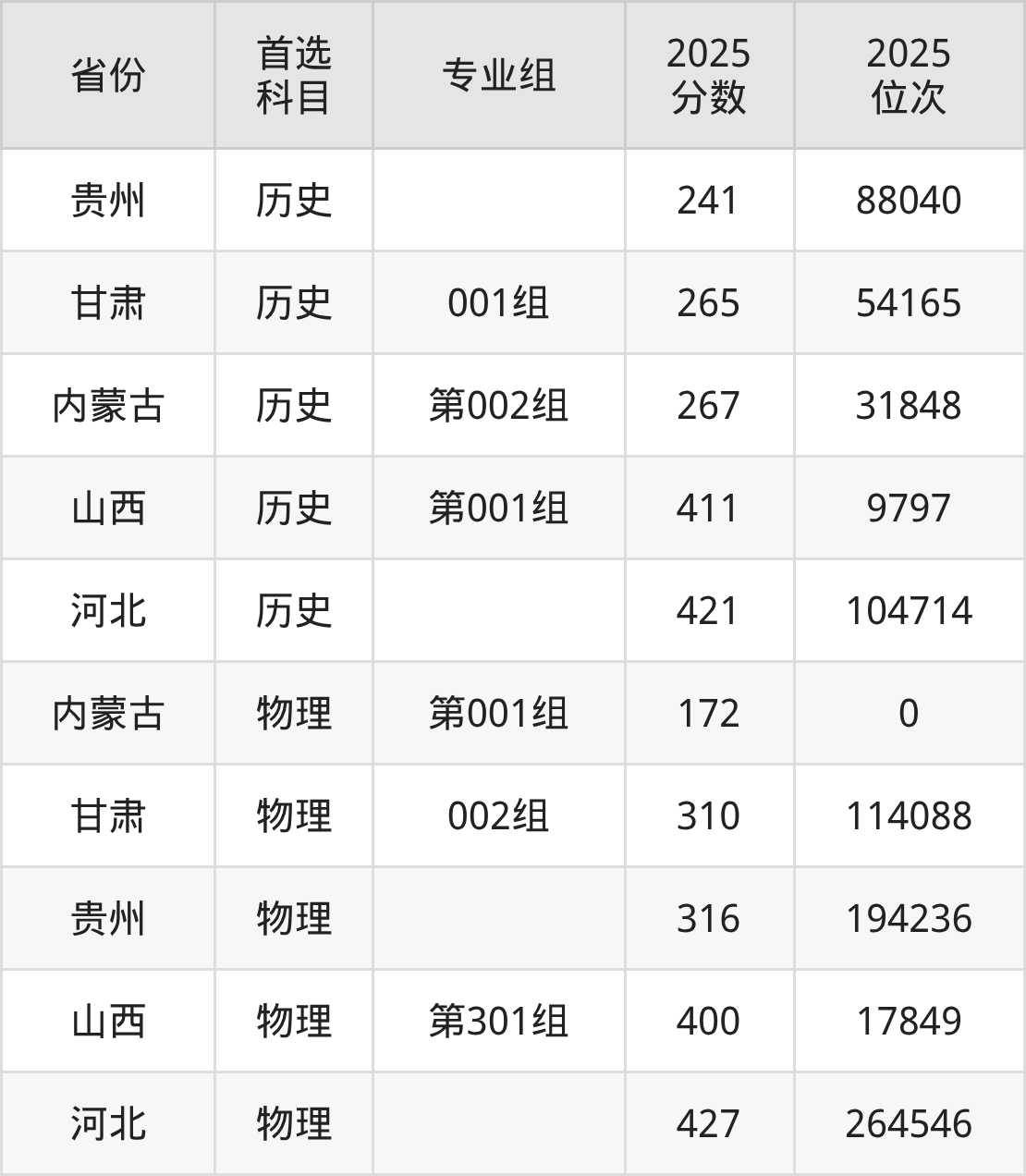 为了方便各地区考生们查看包头钢铁职业技术学院的录取情况,本文也整理出2025年包头钢铁职业技术学院在全国各省的录取分数线,供参考。
