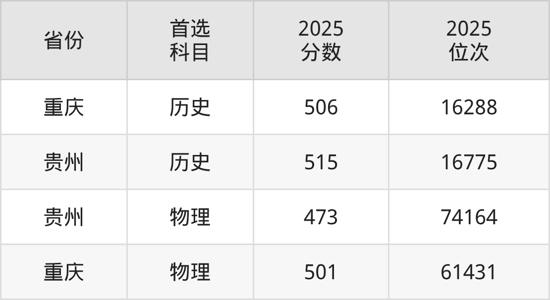 历史类最低分对应地区为重庆,录取位次为16288,超本科线68分;最高分对应地区为贵州,录取位次为16775,超本科线57分。