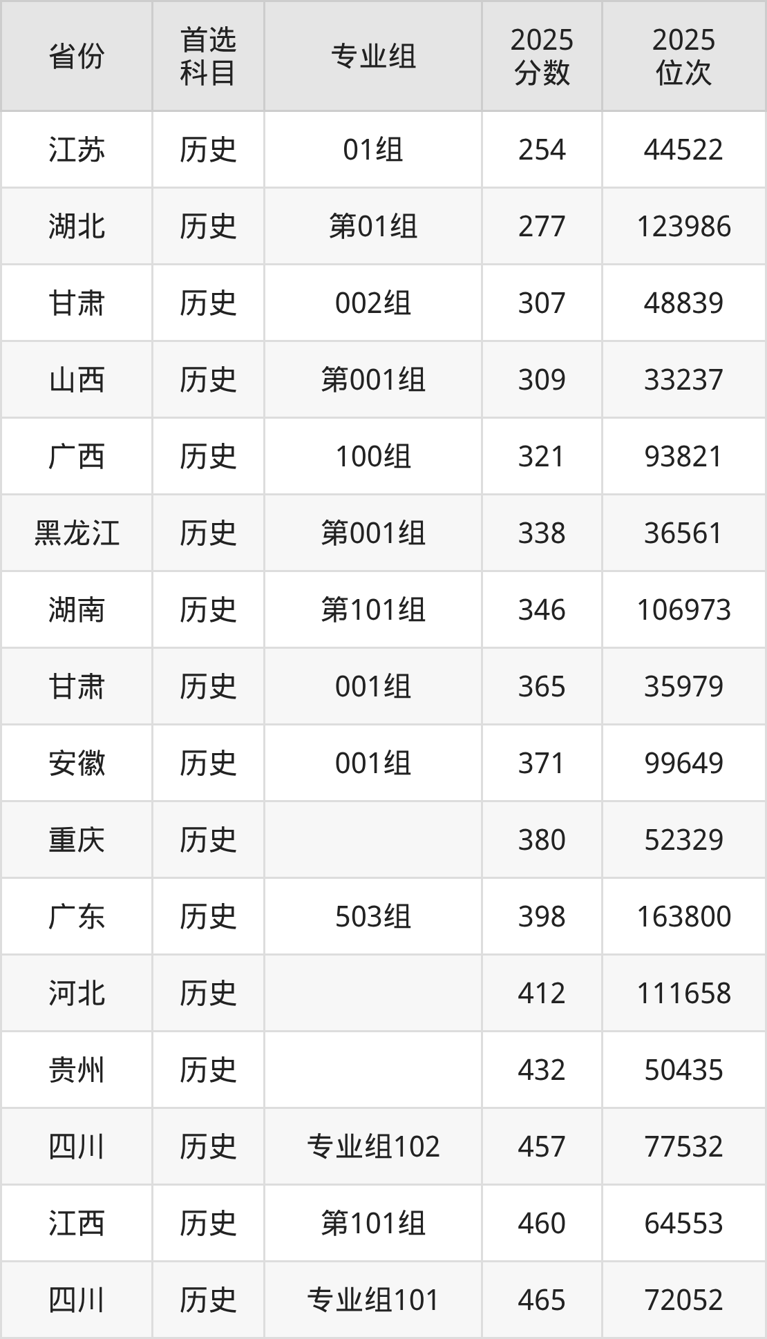 历史类最低分对应地区为江苏(01组),录取位次为44522,超专科线34分;最高分对应地区为四川(专业组101),录取位次为72052,超专科线315分。