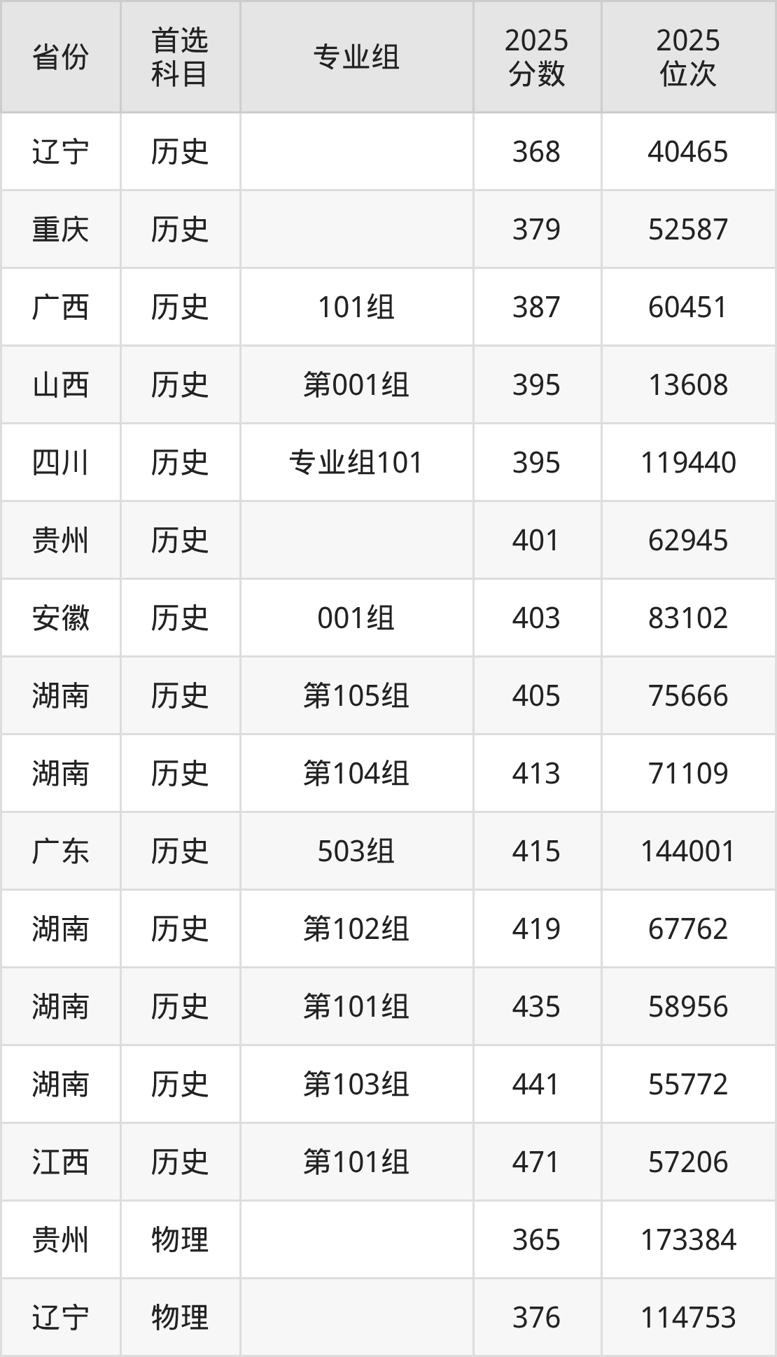 历史类最低分对应地区为辽宁,录取位次为40465,超专科线218分;最高分对应地区为江西(第101组),录取位次为57206,超专科线181分。