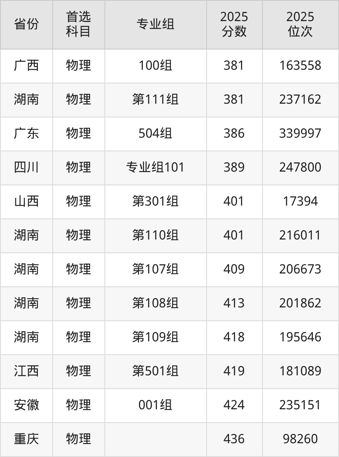物理类最低分对应地区为贵州,录取位次为173384,超专科线185分;最高分对应地区为重庆,录取位次为98260,超专科线256分。