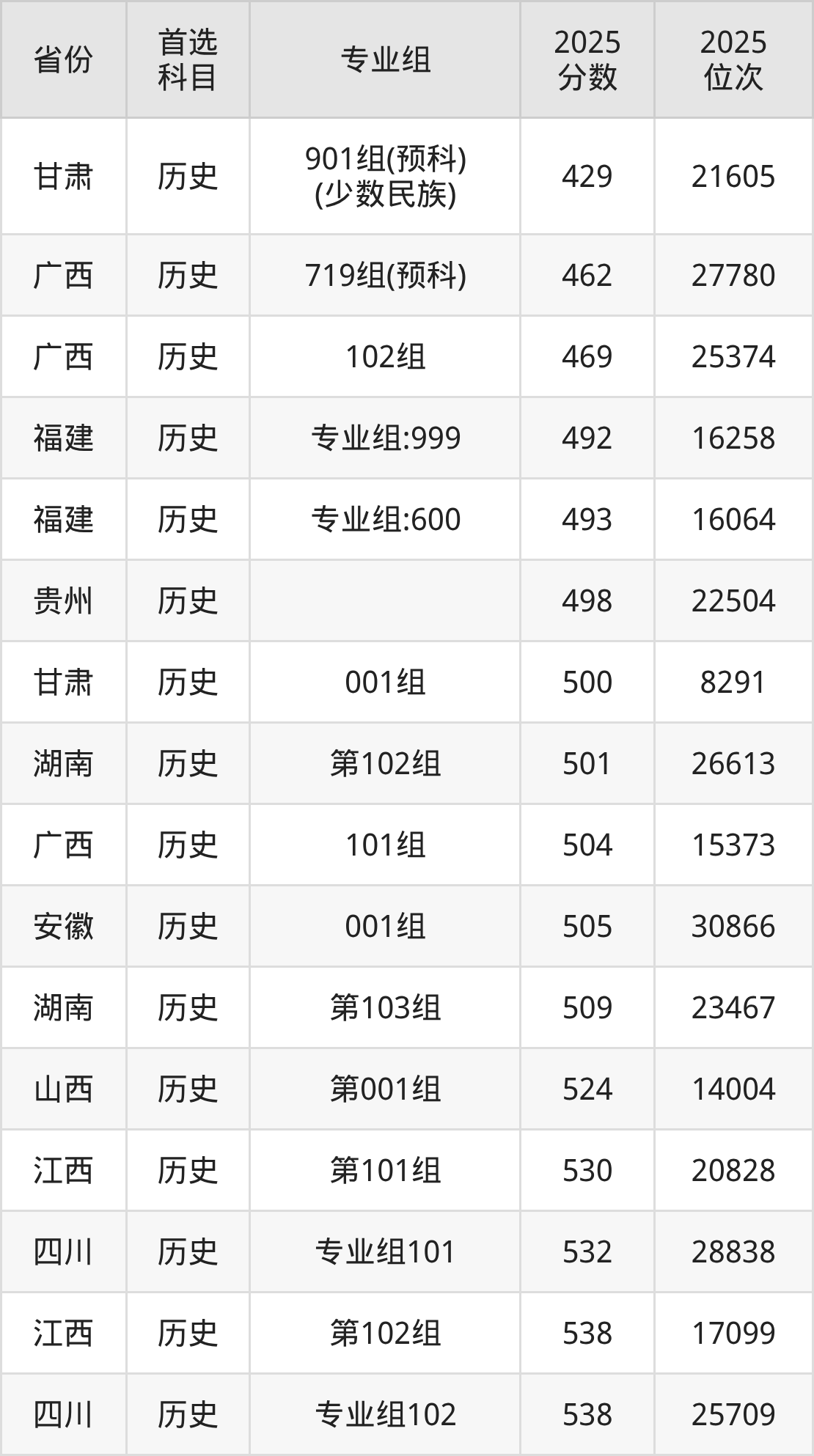 历史类最低分对应地区为甘肃(901组(预科)(少数民族)),录取位次为21605,超本科线17分;最高分对应地区为四川(专业组102),录取位次为25709,超本科B71分。