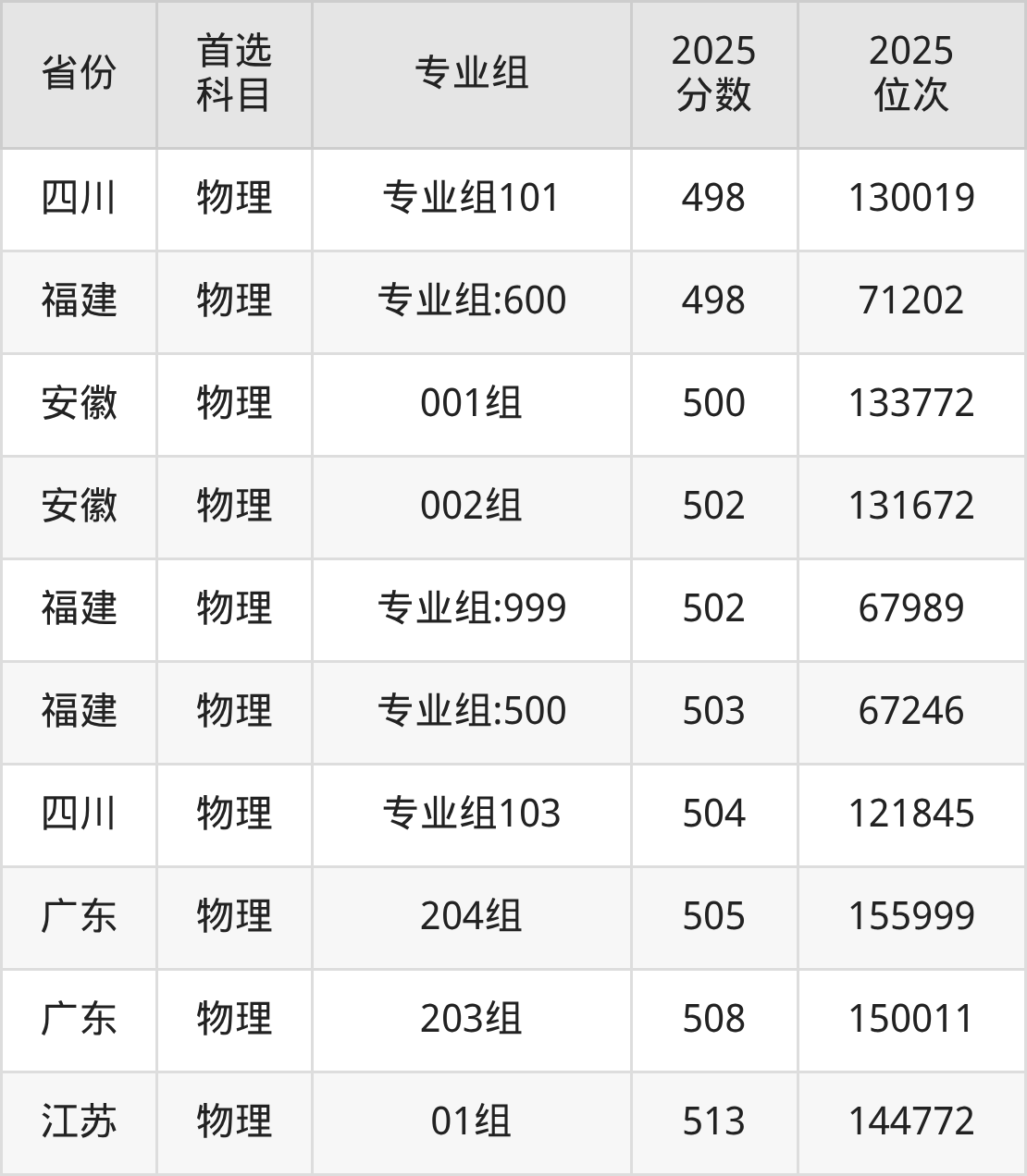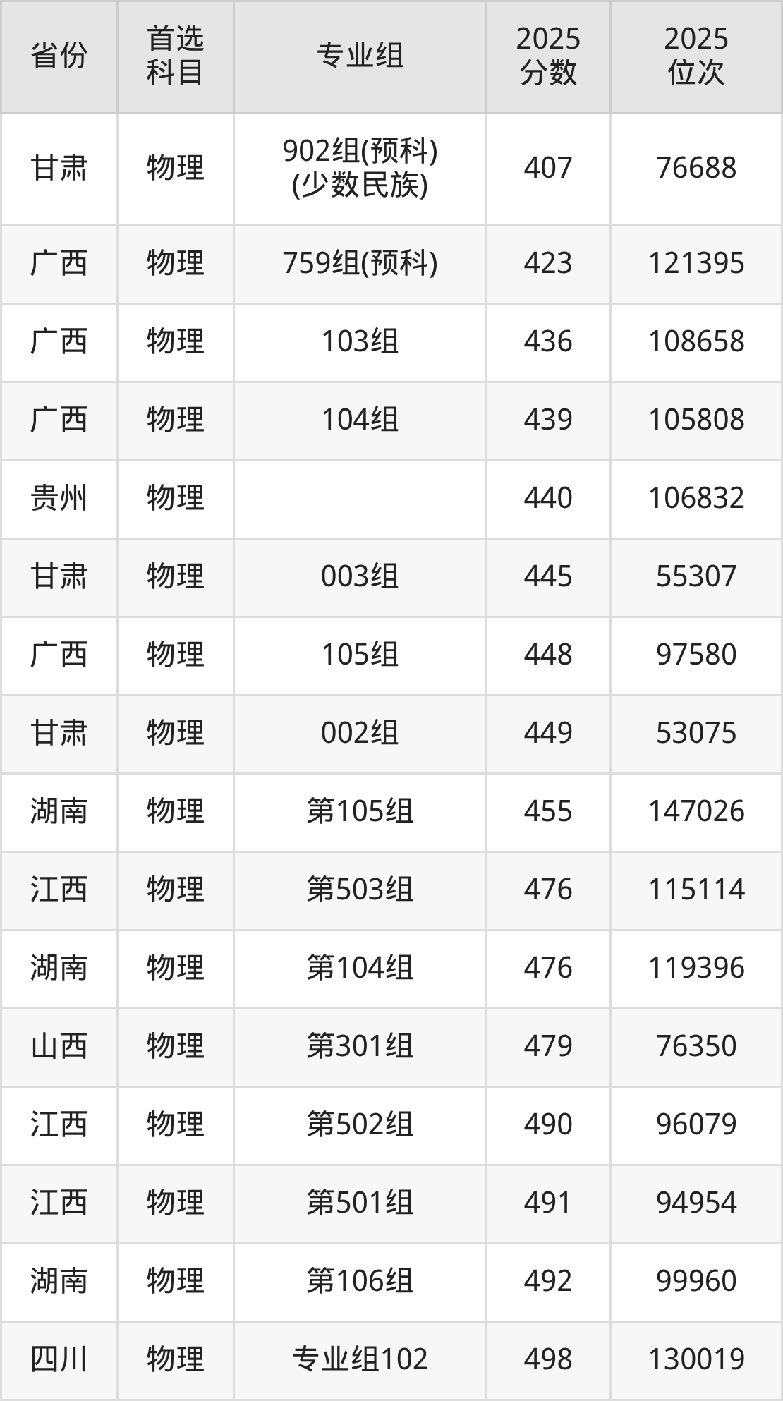 物理类最低分对应地区为甘肃(902组(预科)(少数民族)),录取位次为76688,超本科线33分;最高分对应地区为江苏(01组),录取位次为144772。