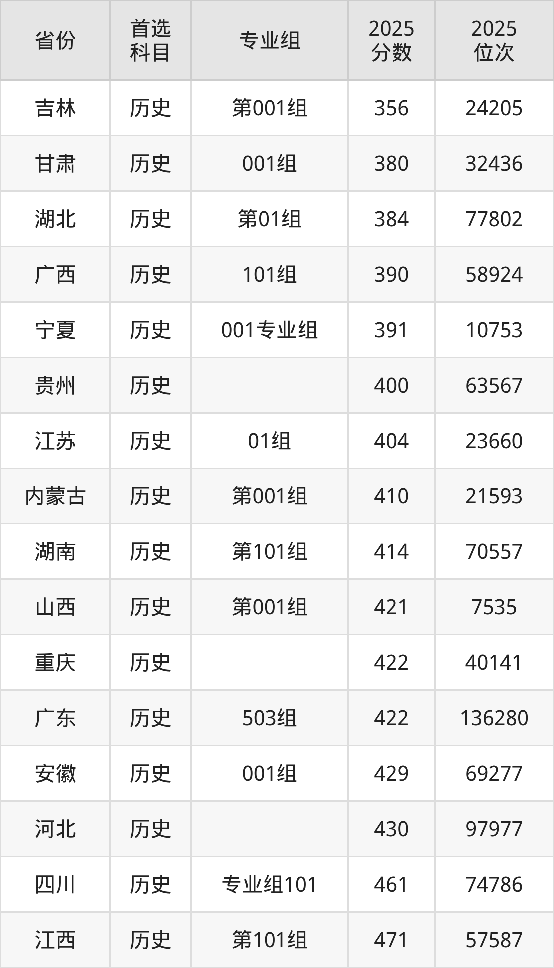 历史类:01组377分、24239名,02组(分段培养)467分、4330名;