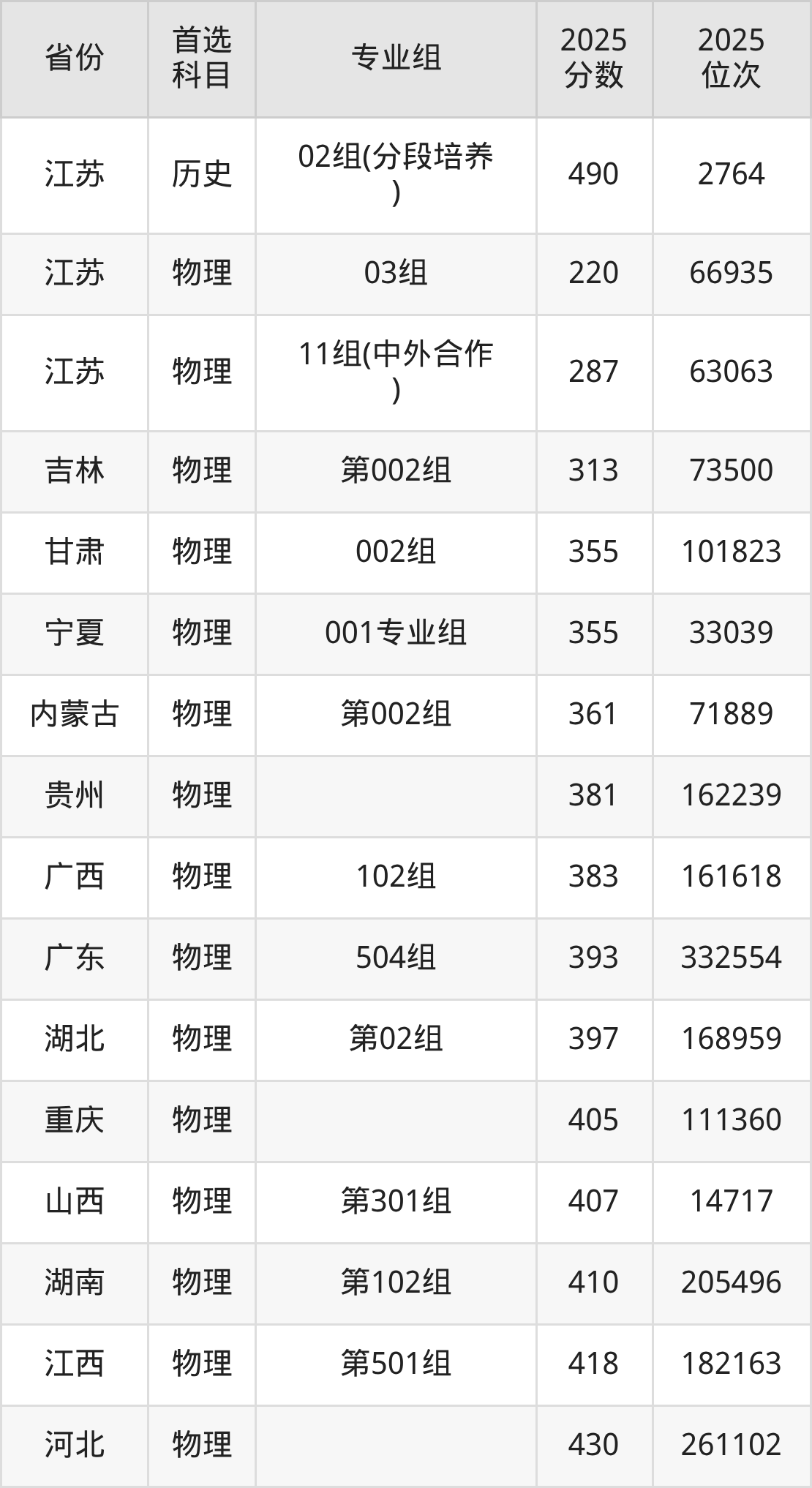 物理类最低分对应地区为江苏(03组),录取位次为66935;最高分对应地区为江苏(05组(分段培养)),录取位次为4689,超专科线264分。