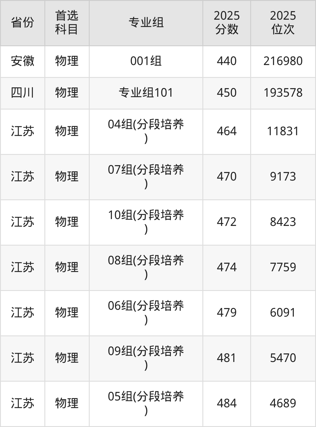 物理类:03组220分、66935名,04组(分段培养)464分、11831名,05组(分段培养)484分、4689名,06组(分段培养)479分、6091名,07组(分段培养)470分、9173名,08组(分段培养)474分、7759名,09组(分段培养)481分、5470名,10组(分段培养)472分、8423名,11组(中外合作)287分、63063名;