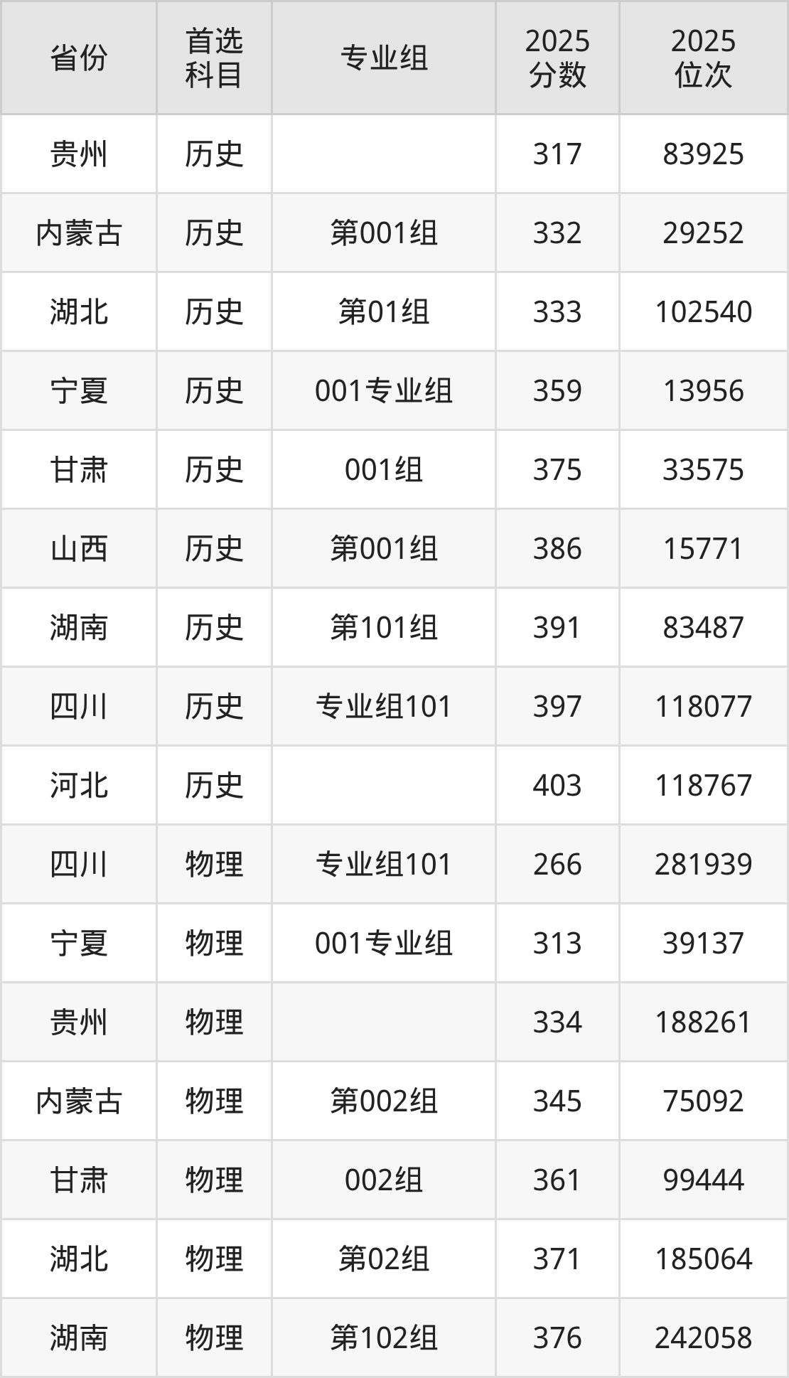 历史类最低分对应地区为贵州,录取位次为83925,超专科线137分;最高分对应地区为河北,录取位次为118767,超专科线203分。