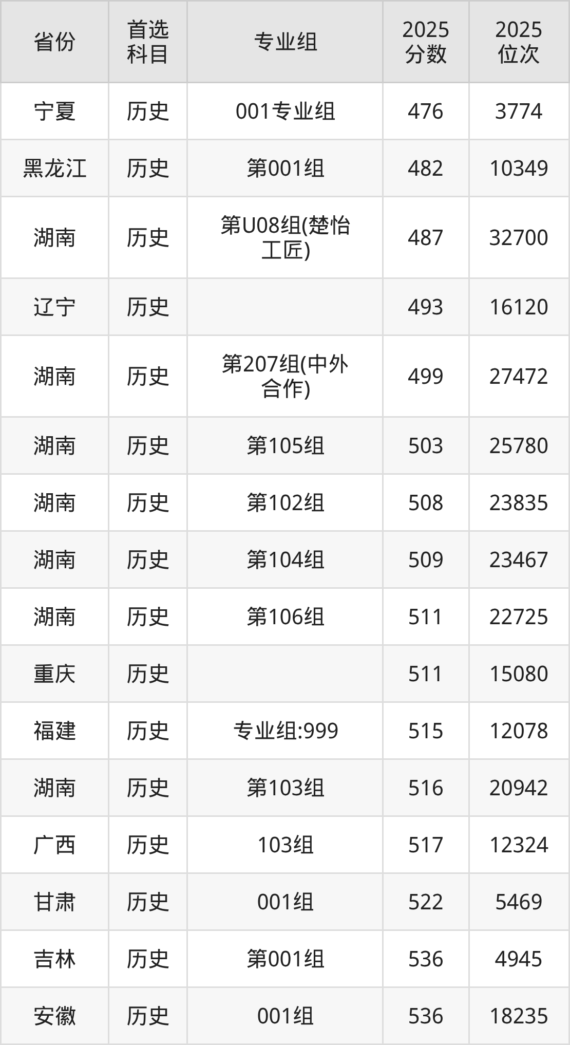 历史类:第101组545分、12060名,第102组508分、23835名,第103组516分、20942名,第104组509分、23467名,第105组503分、25780名,第106组511分、22725名,第207组(中外合作)499分、27472名,第U08组(楚怡工匠)487分、32700名;