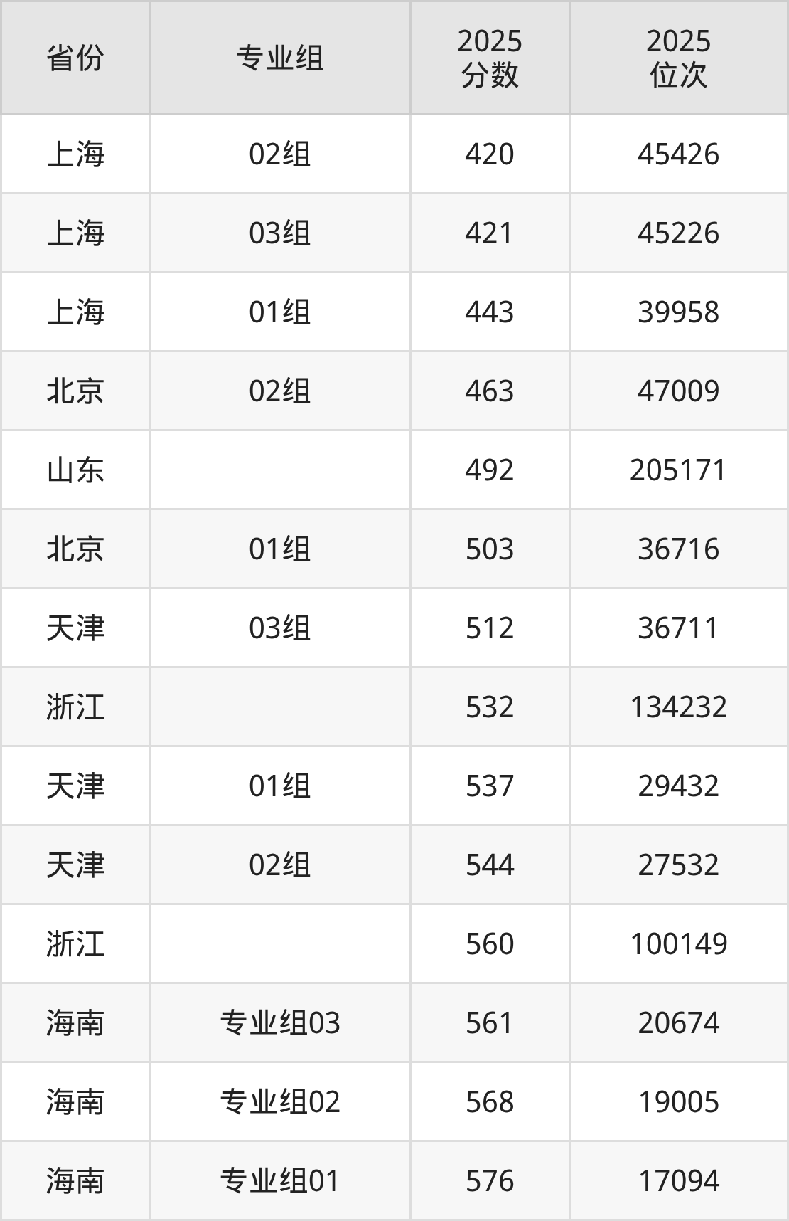 最低分对应地区为上海(02组),录取位次为45426,超本科线18分;最高分对应地区为海南(专业组01),录取位次为17094,超本科线96分。
