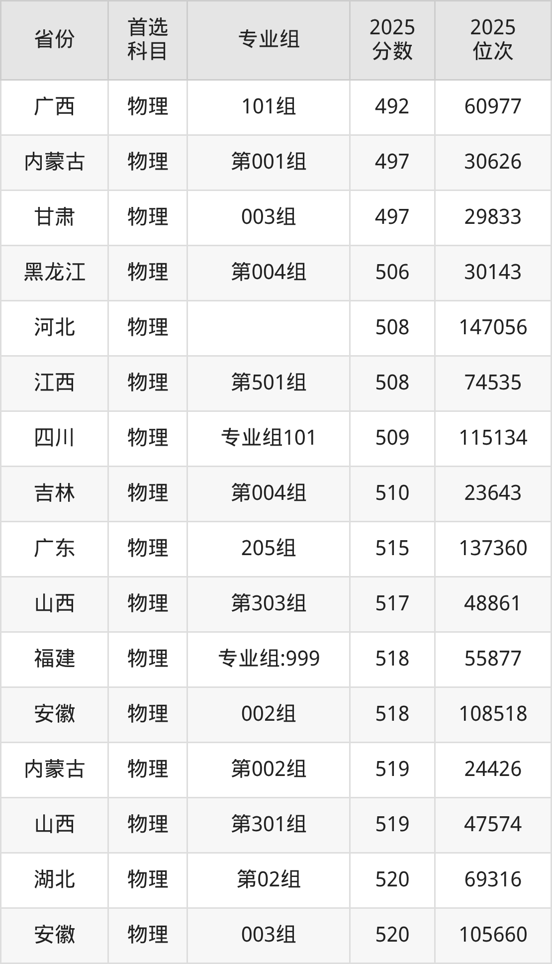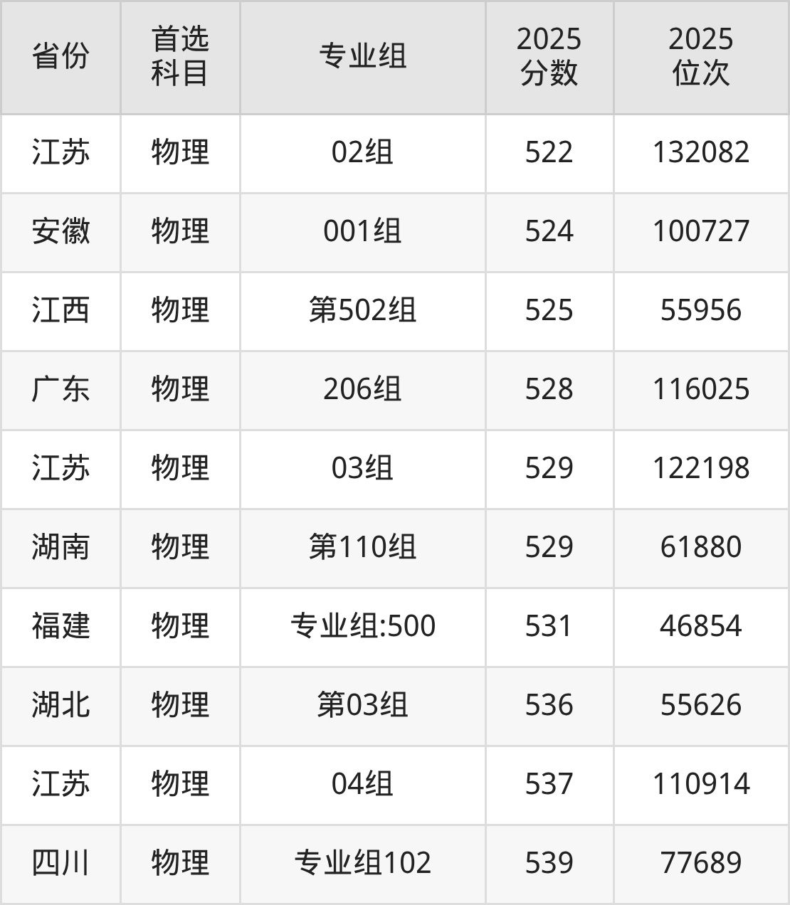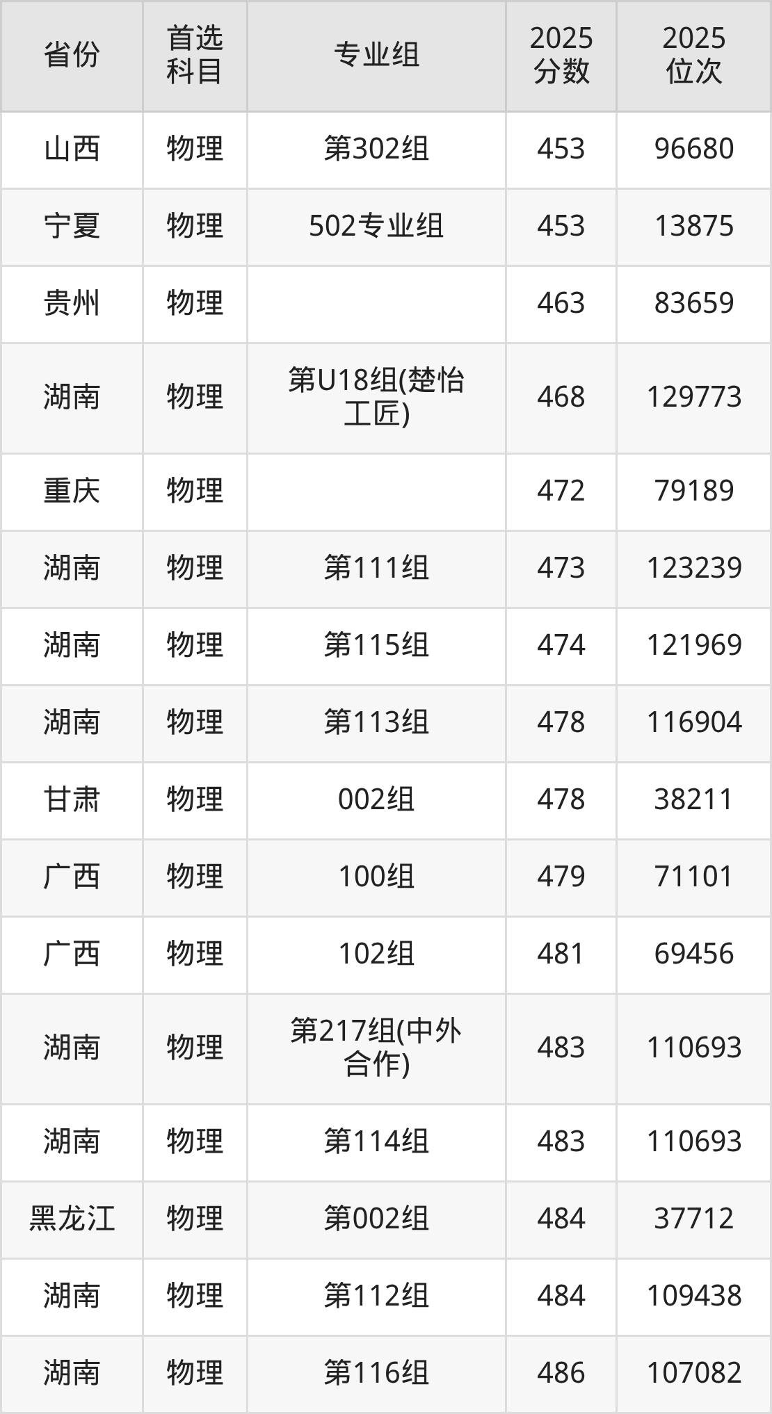 物理类:第114组491分、89647名,第115组482分、98445名,第116组466分、114644名,第117组479分、101448名,第118组480分、100457名,第119组489分、91611名,第120组479分、101448名,第121组478分、102477名,第122组465分、115700名,第123组473分、107543名,第124组471分、109561名,第127组476分、104439名,第128组481分、99466名,第129组477分、103466名,第225组(中外合作)462分、118904名,第U26组(楚怡工匠)447分、134834名。