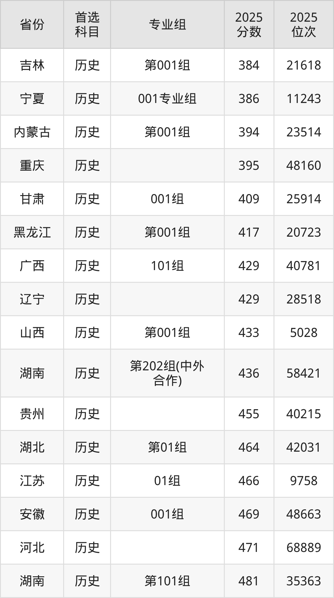 历史类:第101组481分、35363名,第202组(中外合作)436分、58421名;