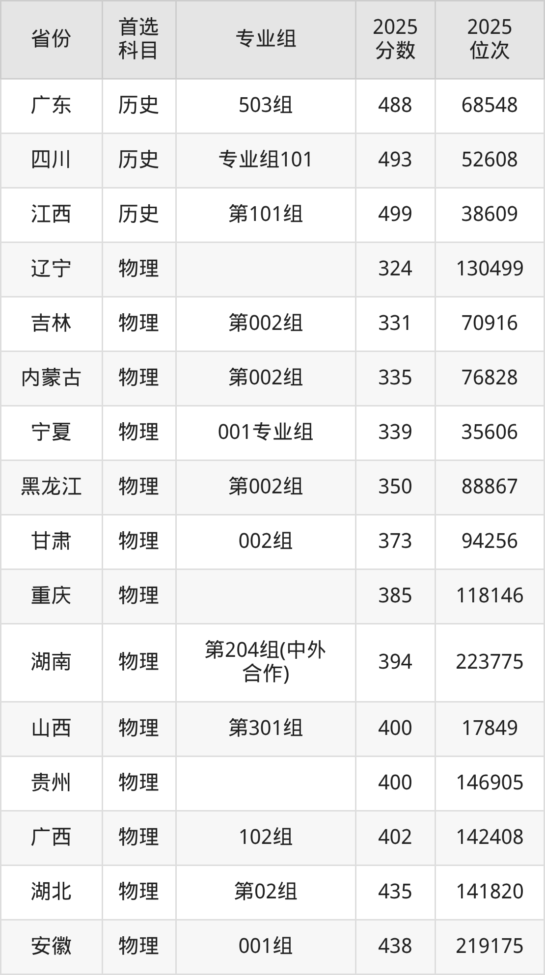 历史类最低分对应地区为吉林(第001组),录取位次为21618,超专科线224分;最高分对应地区为江西(第101组),录取位次为38609,超专科线209分。