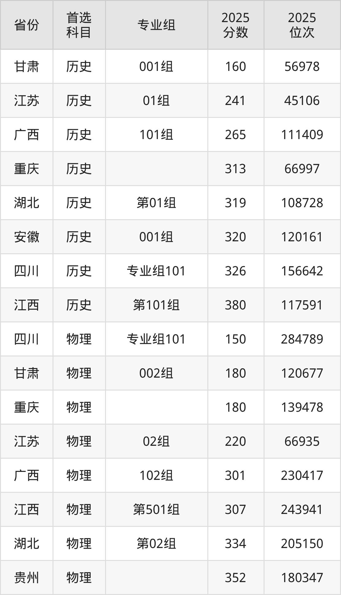 历史类最低分对应地区为甘肃(001组),录取位次为56978;最高分对应地区为江西(第101组),录取位次为117591。