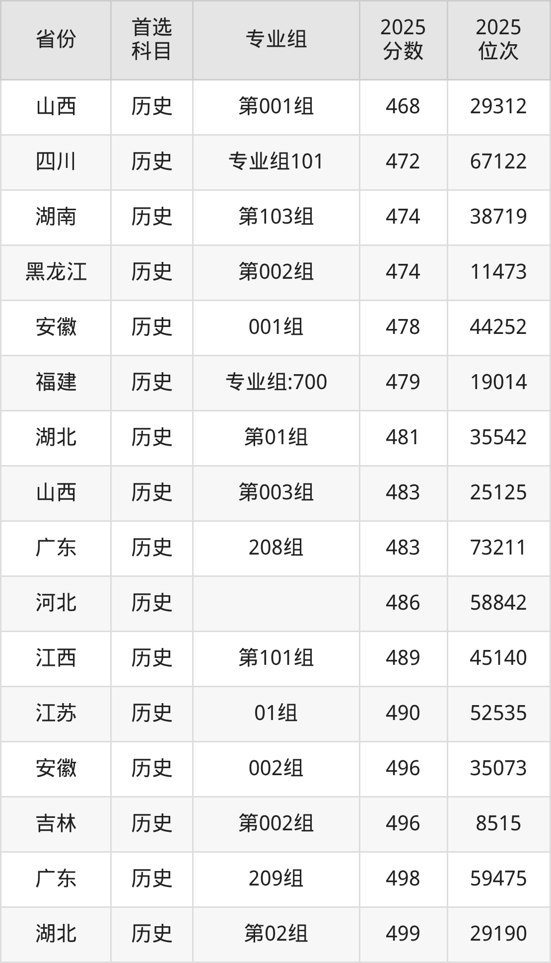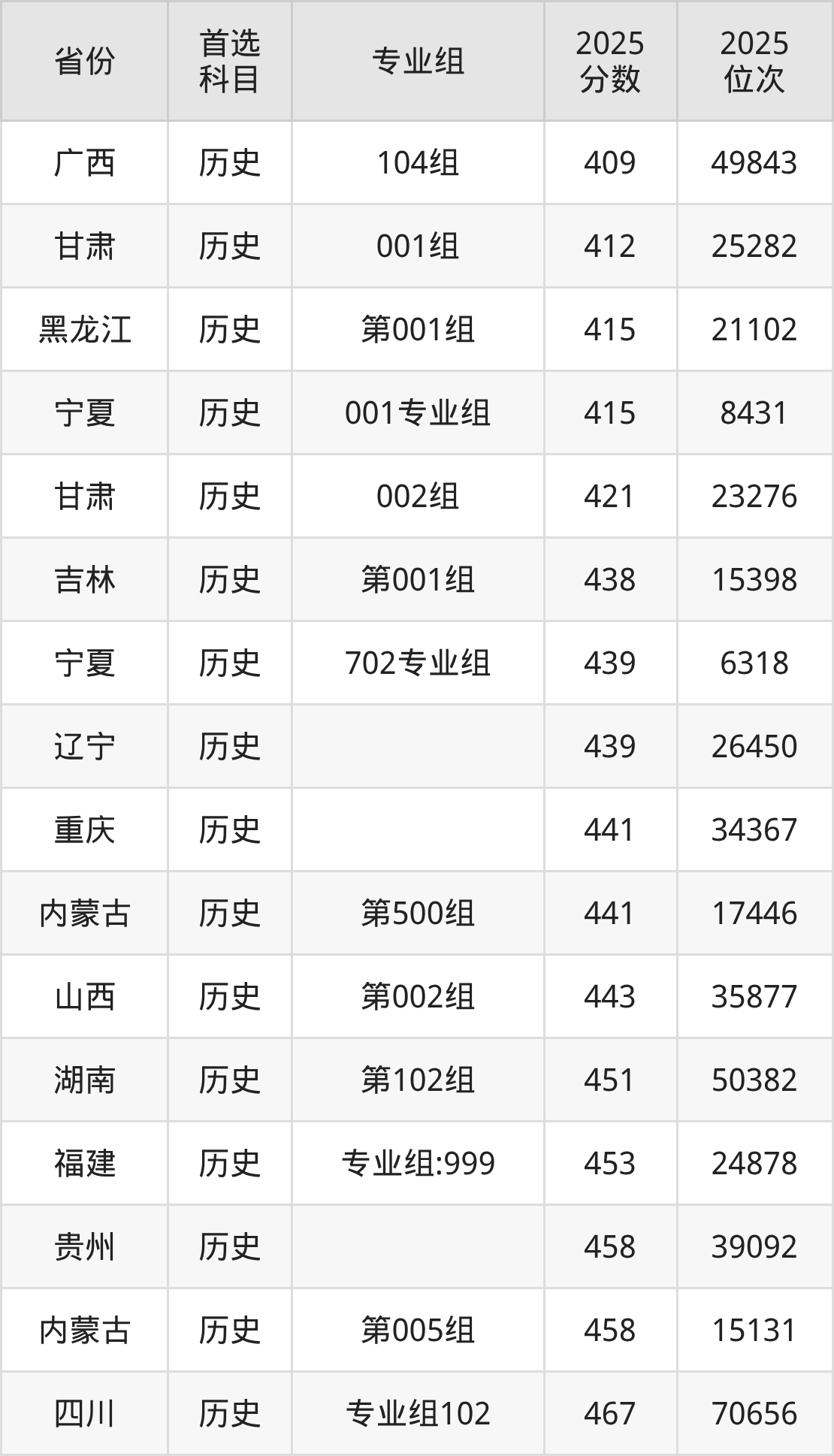 历史类最低分对应地区为广西(104组),录取位次为49843,超本科线7分;最高分对应地区为广东(210组),录取位次为41054,超本科线59分。