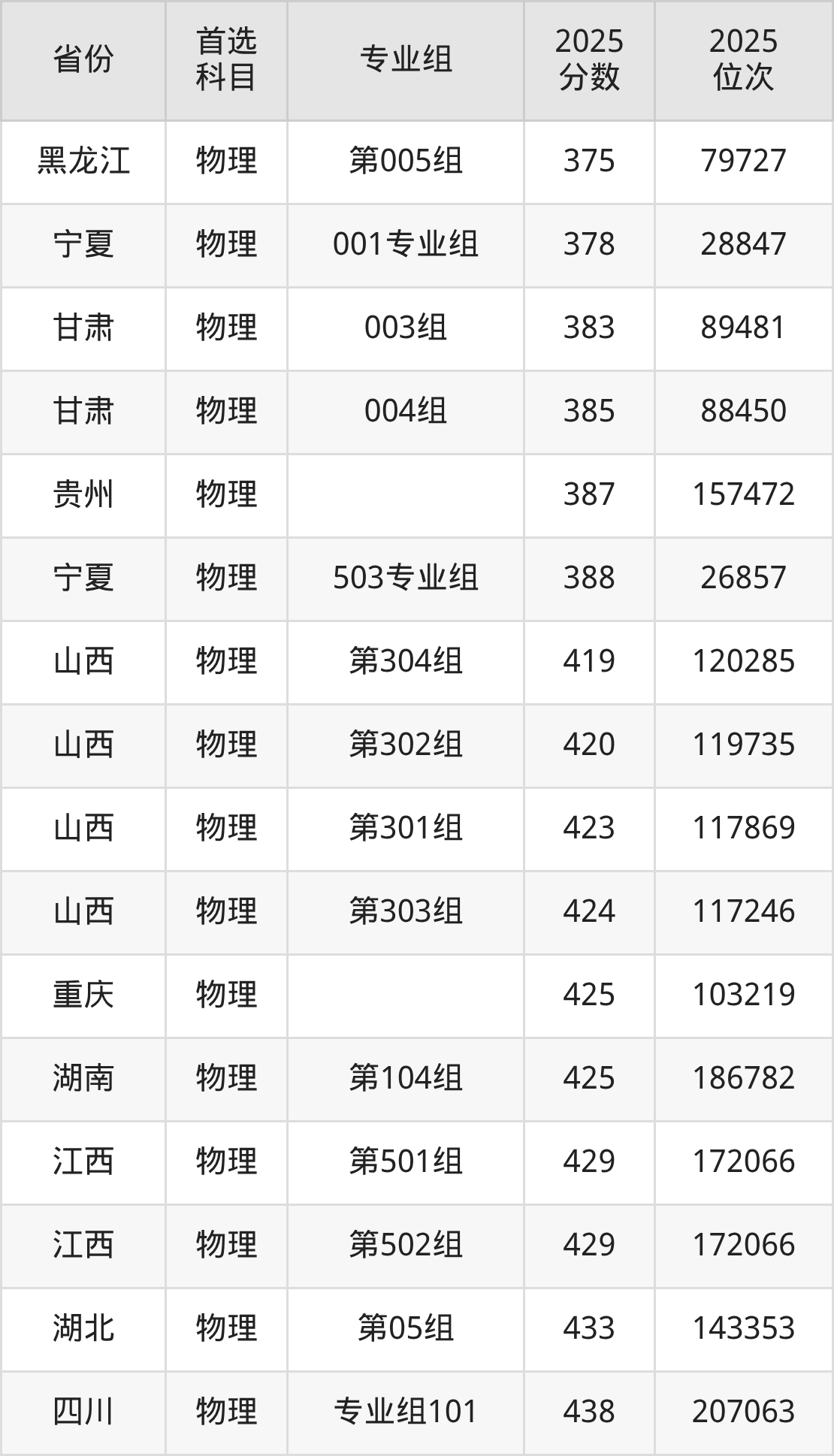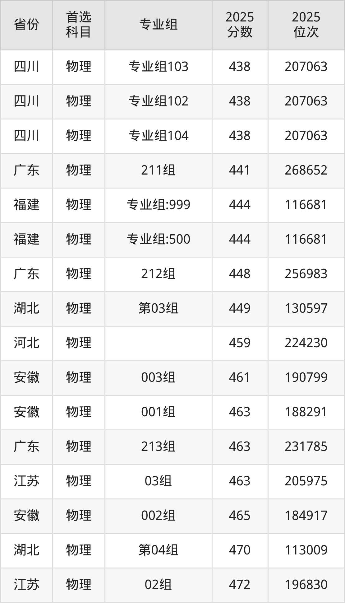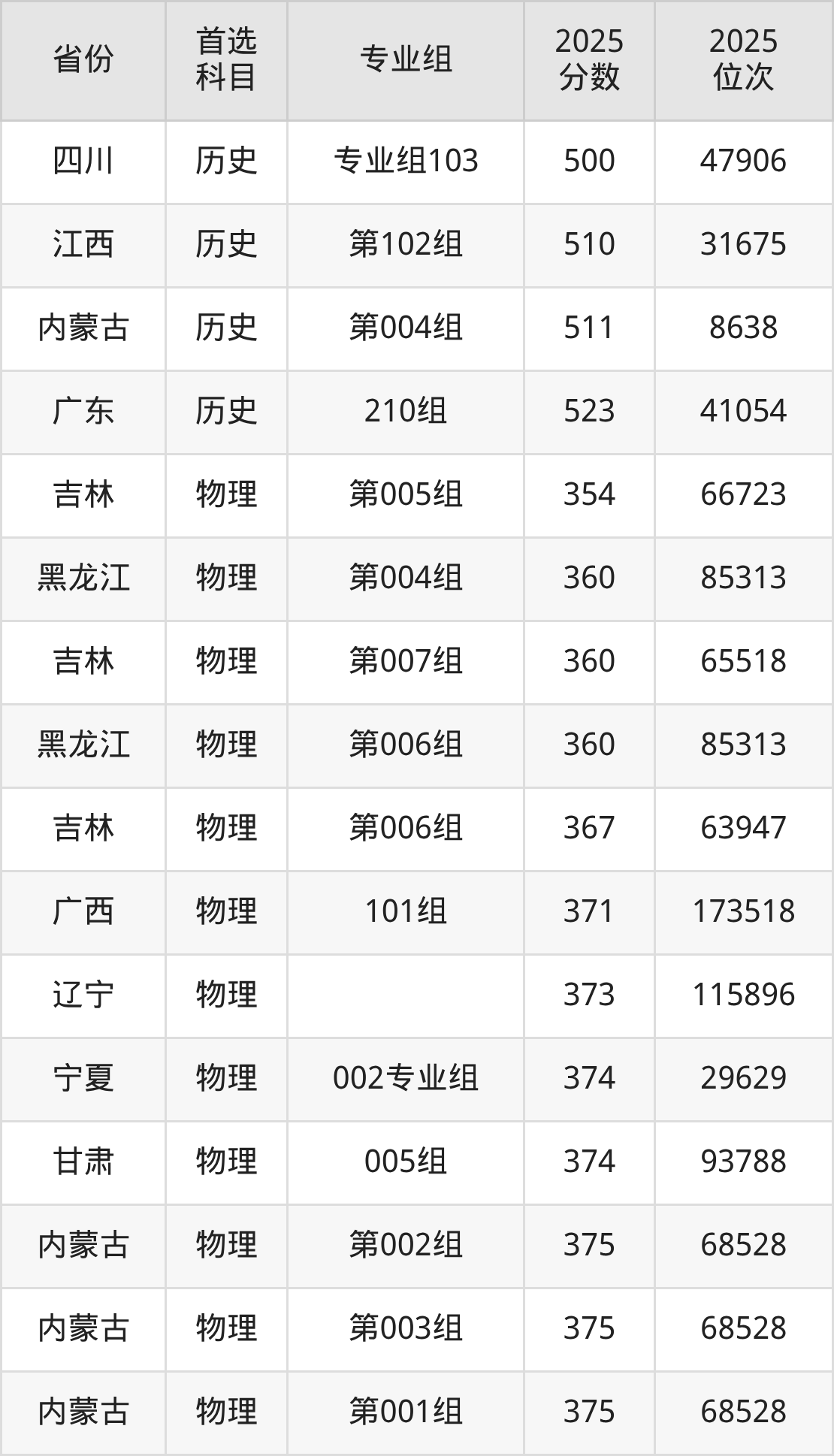 物理类最低分对应地区为吉林(第005组),录取位次为66723,超本科线14分;最高分对应地区为江苏(02组),录取位次为196830,超本科线9分。