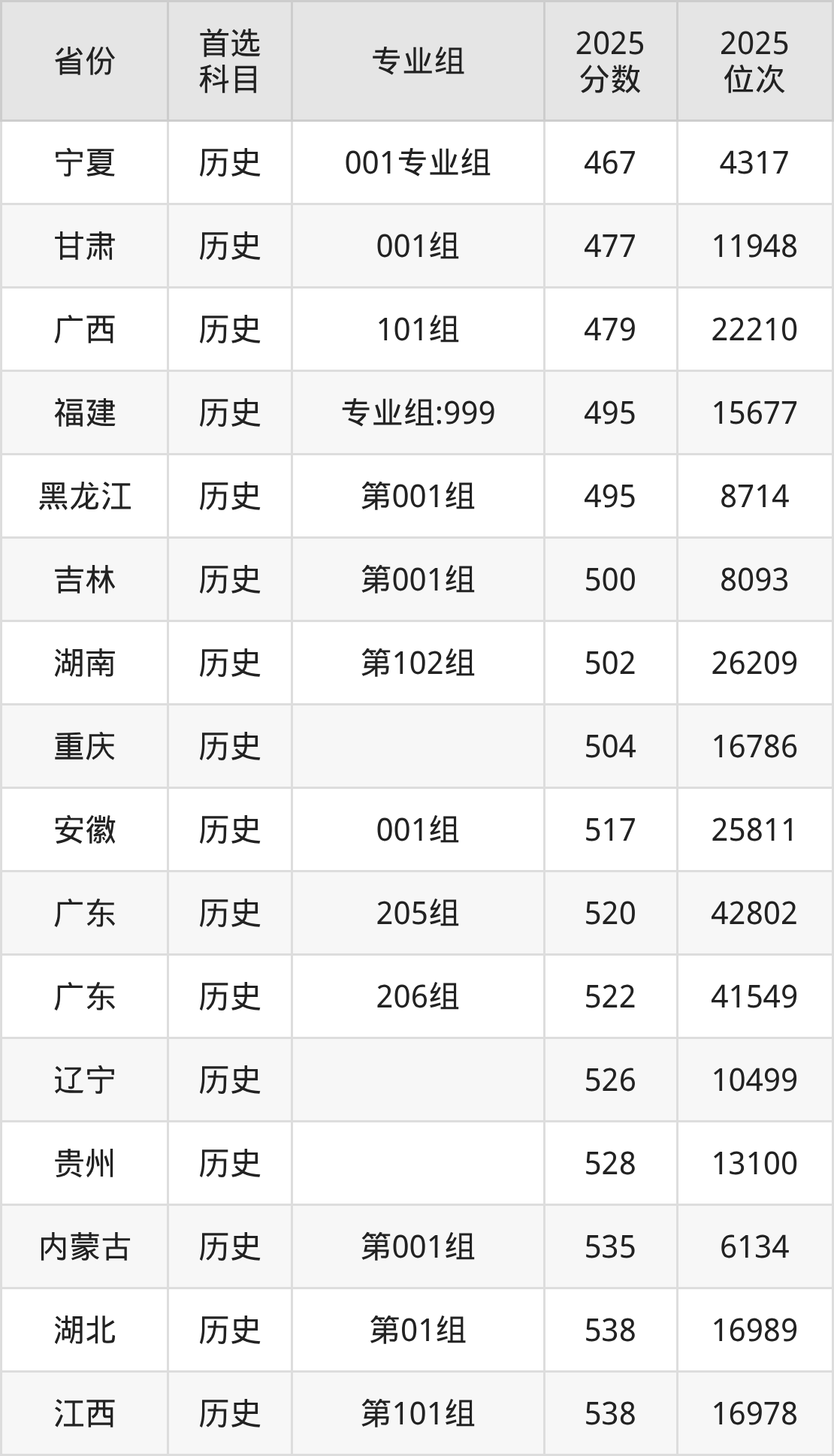 历史类最低分对应地区为宁夏(001专业组),录取位次为4317,超本科B63分;最高分对应地区为河北,录取位次为24943,超本科线68分。