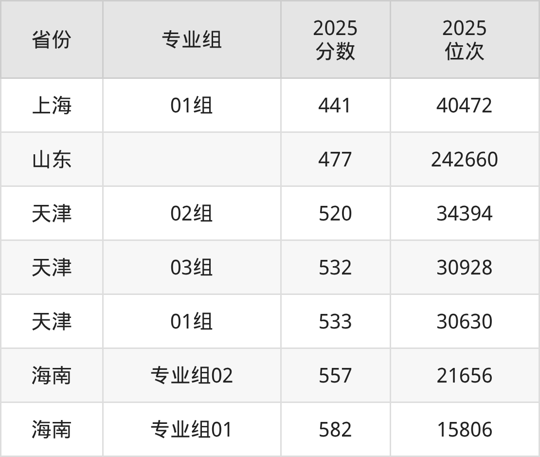 最低分对应地区为上海(01组),录取位次为40472,超本科线39分;最高分对应地区为海南(专业组01),录取位次为15806,超本科线102分。