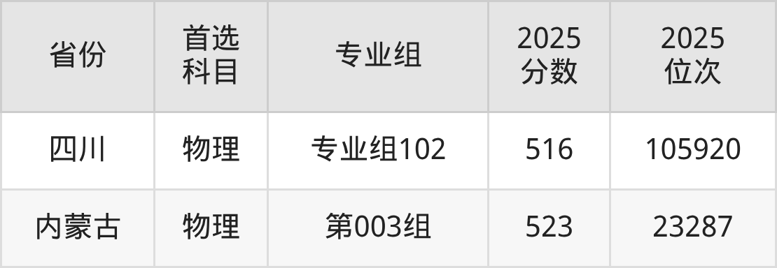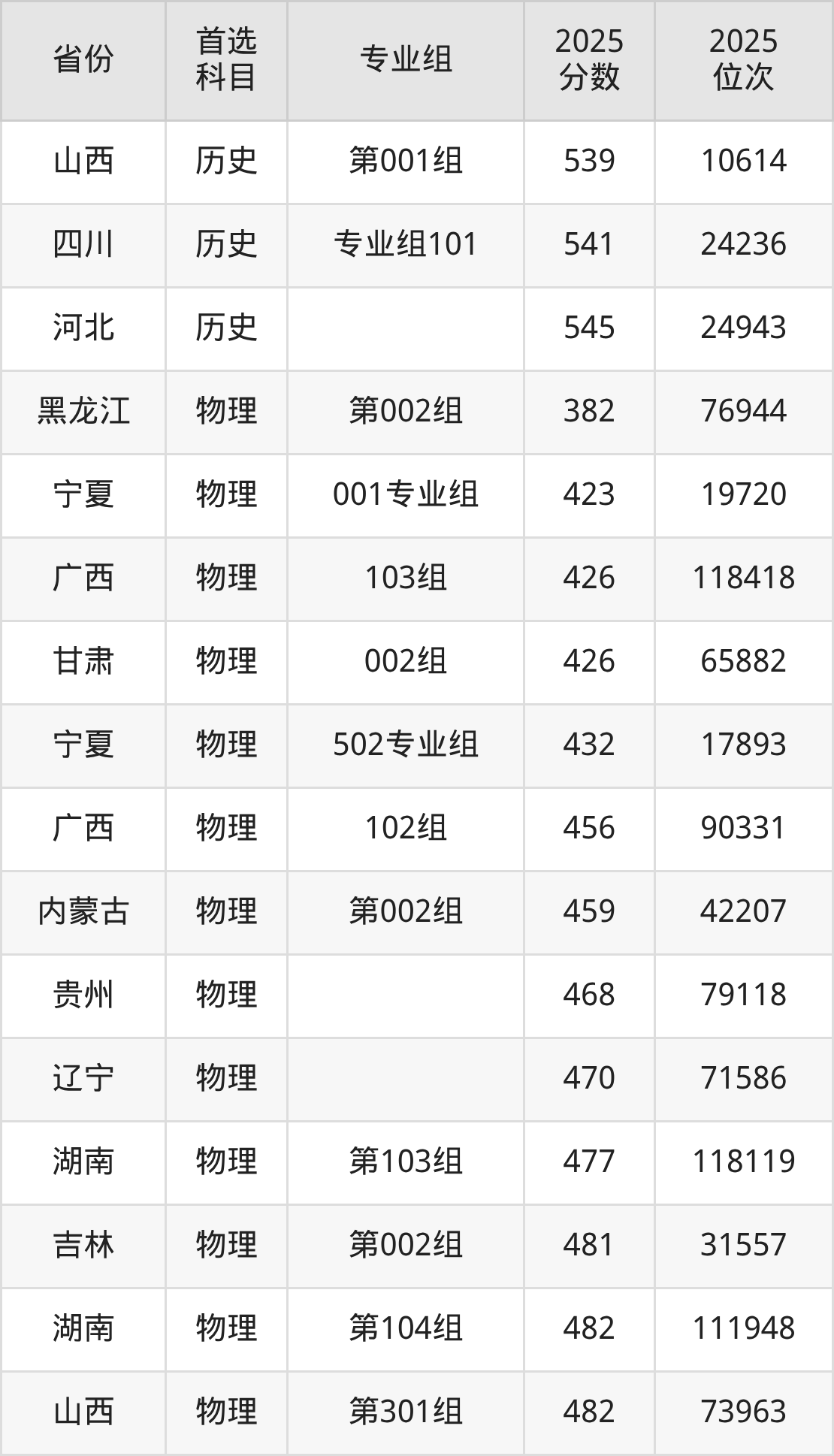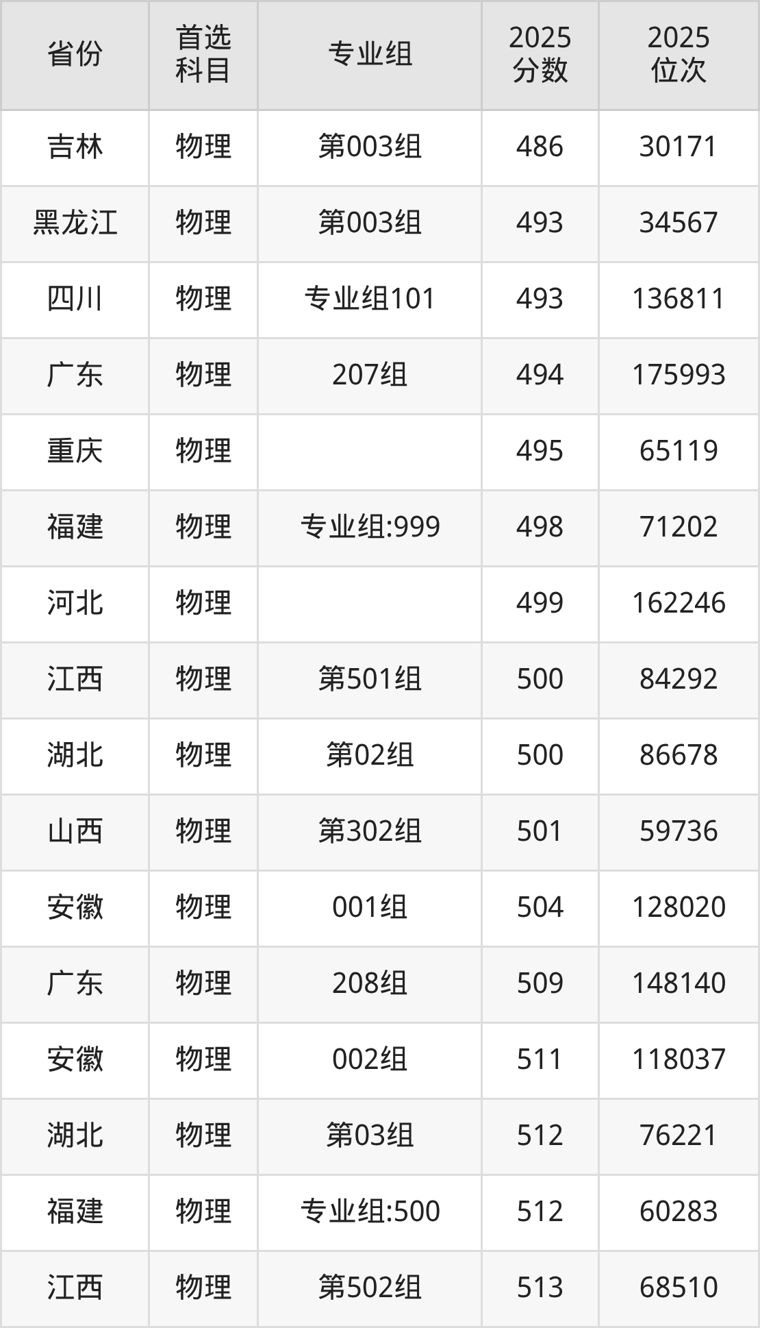 物理类最低分对应地区为黑龙江(第002组),录取位次为76944,超本科线22分;最高分对应地区为内蒙古(第003组),录取位次为23287,超本科线148分。