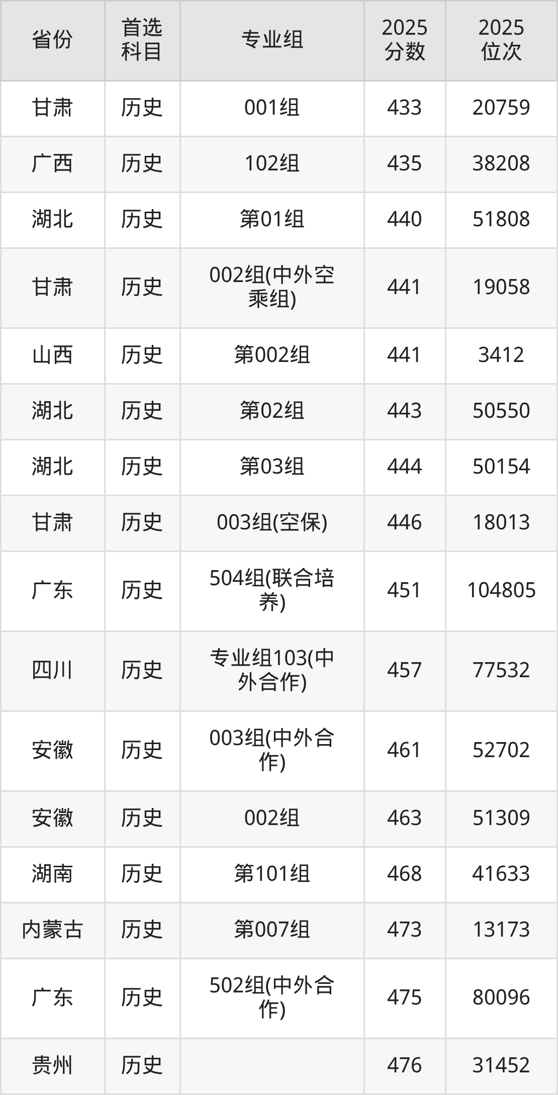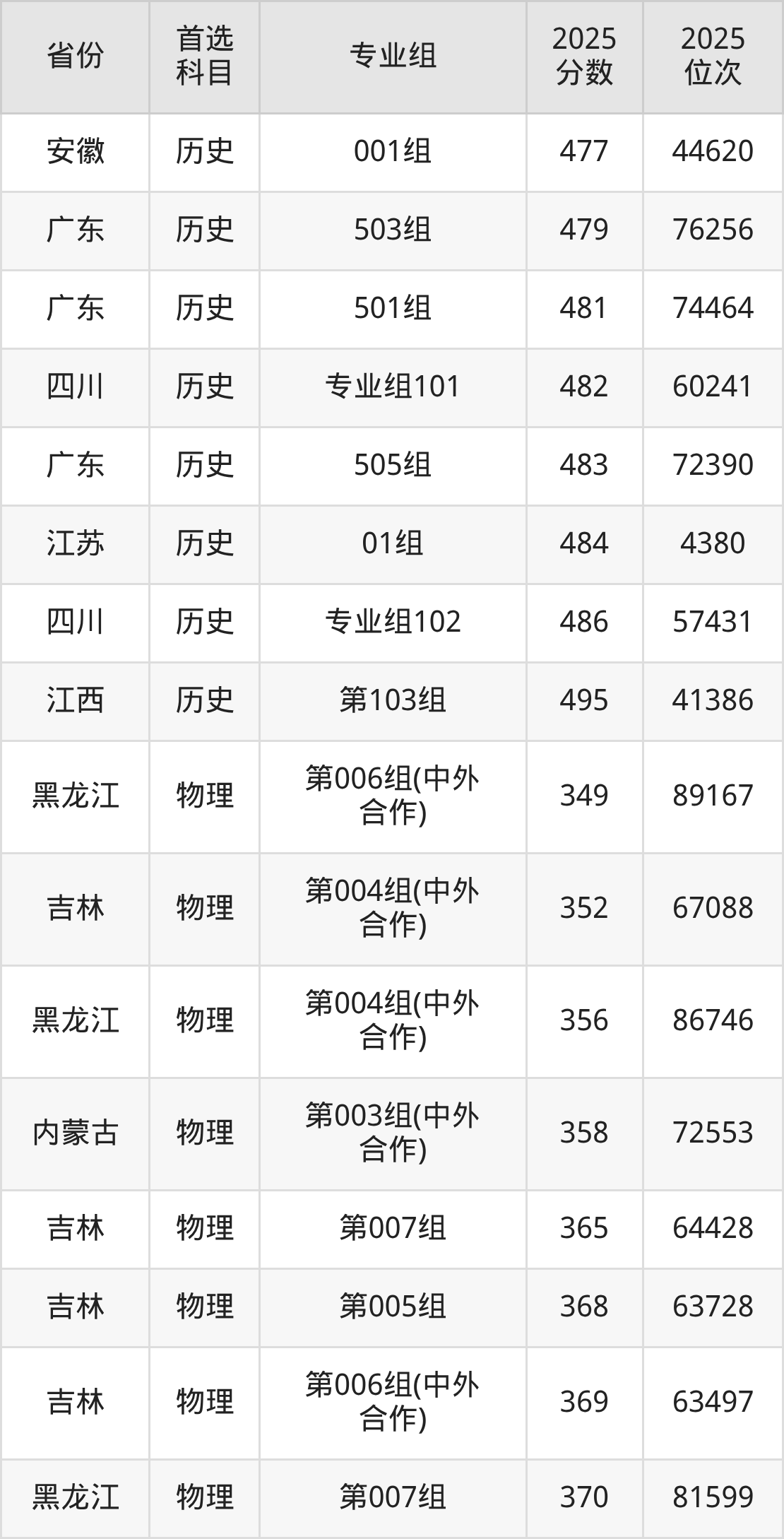 历史类最低分对应地区为黑龙江(第002组(中外合作)),录取位次为31794,超专科线201分;最高分对应地区为江西(第103组),录取位次为41386,超专科线205分。