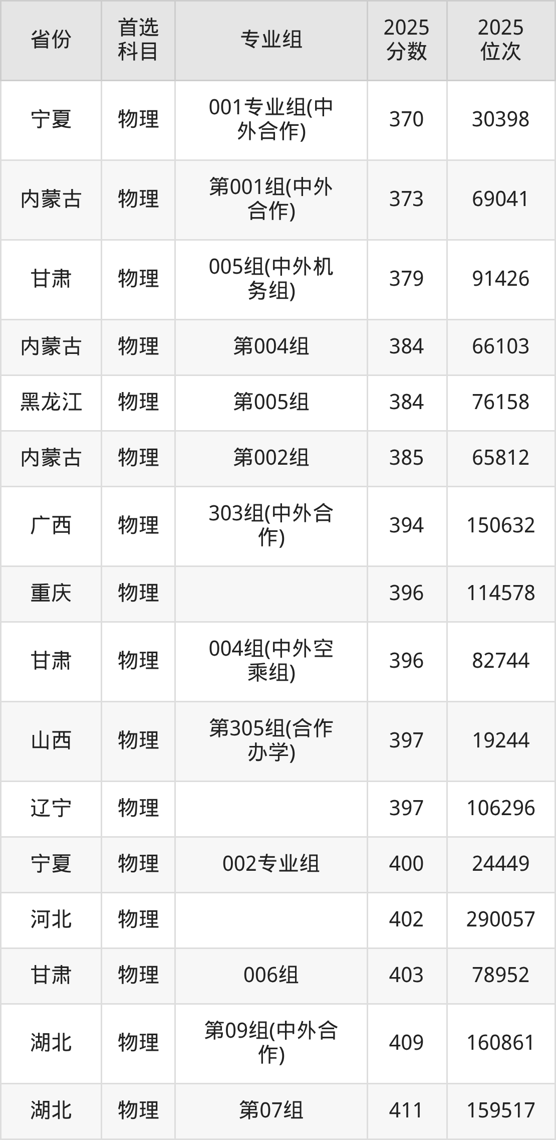 物理类最低分对应地区为黑龙江(第006组(中外合作)),录取位次为89167,超专科线189分;最高分对应地区为安徽(001组),录取位次为168357,超专科线277分。