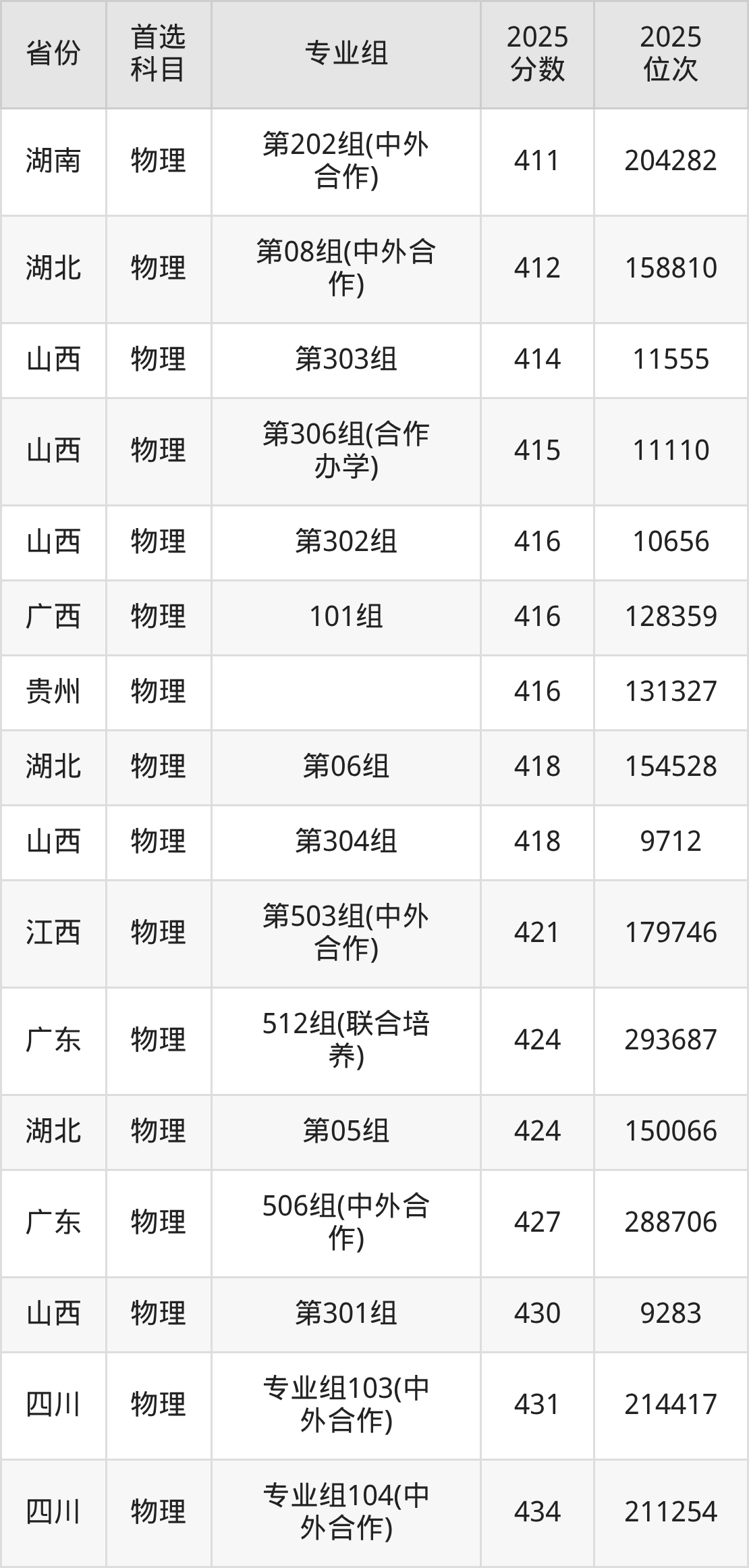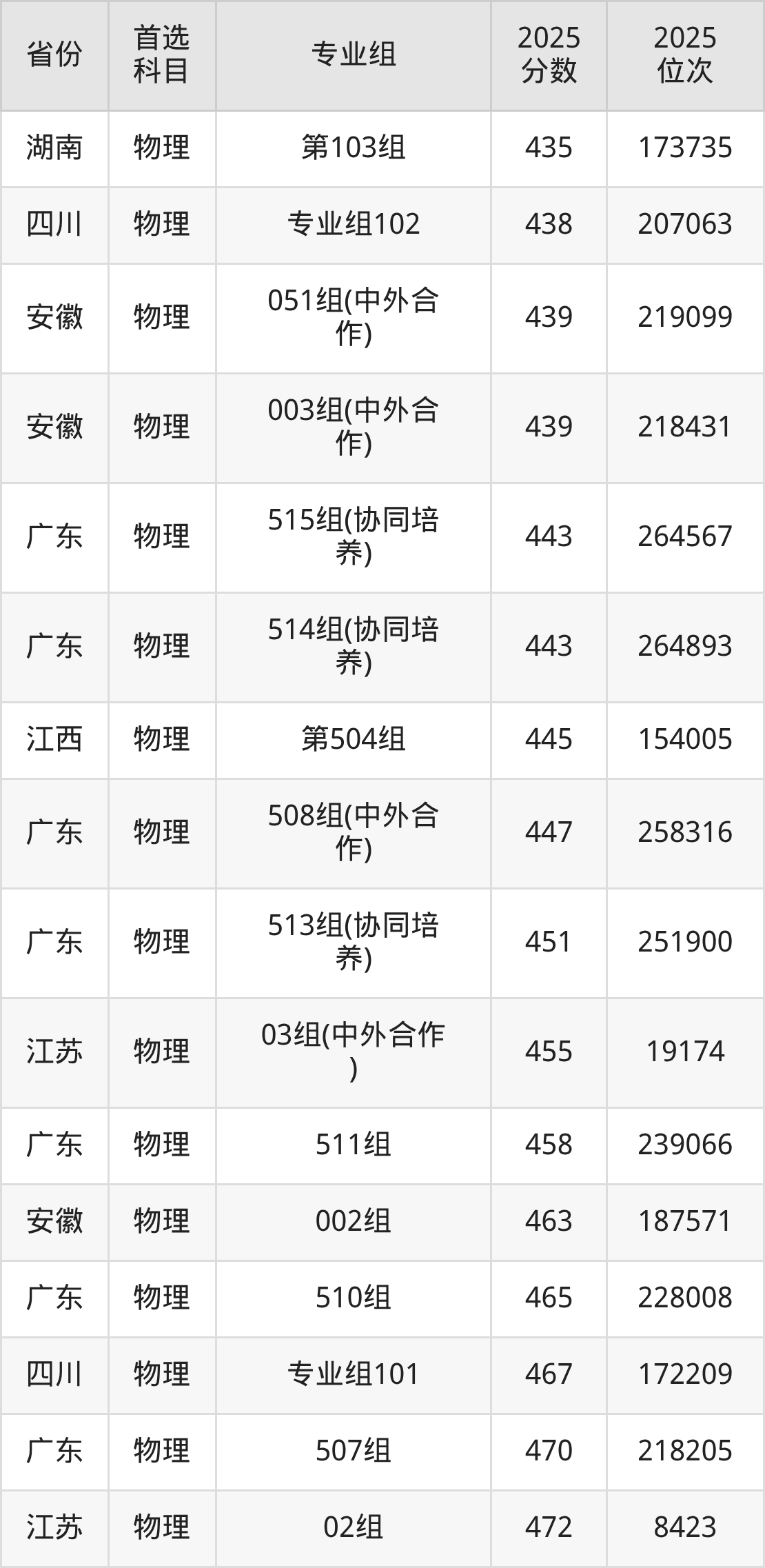 物理类:506组(中外合作)427分、288706名,507组470分、218205名,508组(中外合作)447分、258316名,509组475分、210260名,510组465分、228008名,511组458分、239066名,512组(联合培养)424分、293687名,513组(协同培养)451分、251900名,514组(协同培养)443分、264893名,515组(协同培养)443分、264567名;