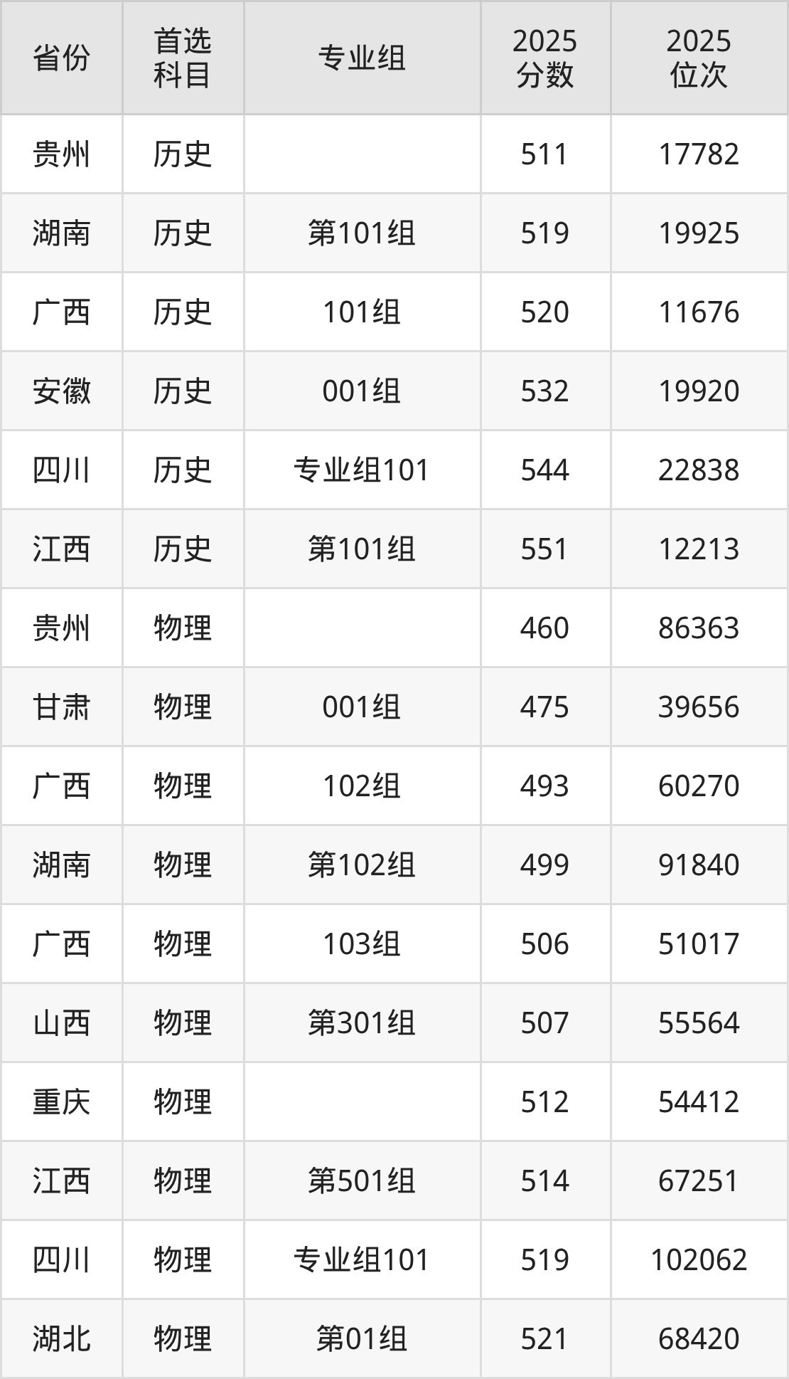 历史类最低分对应地区为贵州,录取位次为17782,超本科线53分;最高分对应地区为江西(第101组),录取位次为12213,超本科线65分。