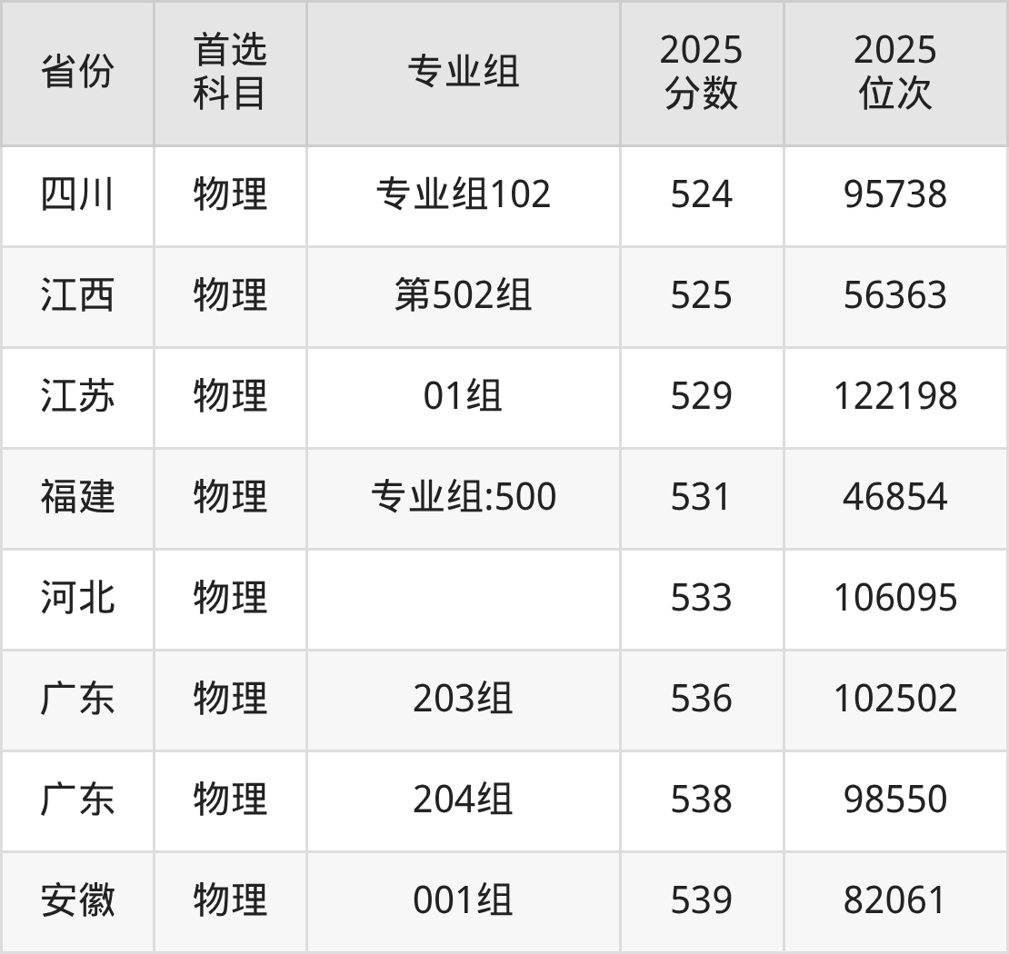 物理类最低分对应地区为贵州,录取位次为86363,超本科线105分;最高分对应地区为安徽(001组),录取位次为82061,超本科线78分。