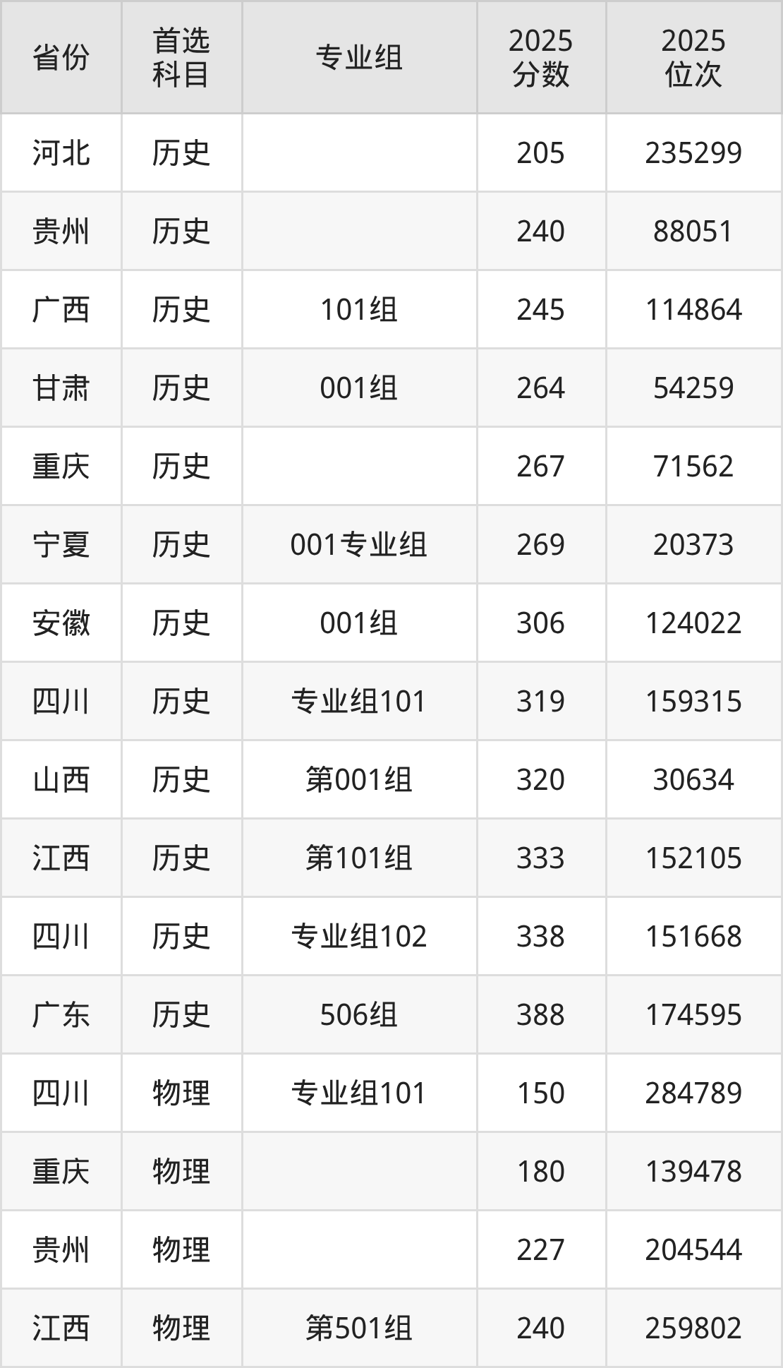历史类最低分对应地区为河北,录取位次为235299,超专科线5分;最高分对应地区为广东(506组),录取位次为174595,超专科线173分。