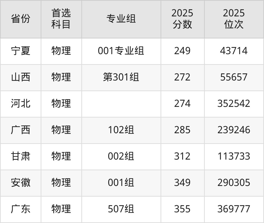 物理类最低分对应地区为四川(专业组101),录取位次为284789;最高分对应地区为广东(507组),录取位次为369777,超专科线155分。