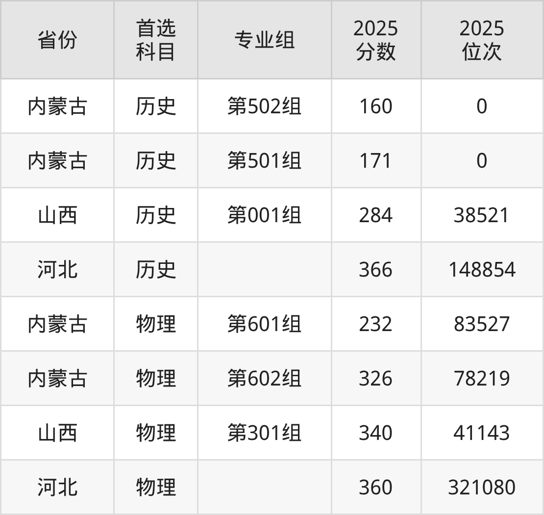 2025年内蒙古能源职业学院在新高考3+1+2地区的录取分数线为:历史类160分-366分、物理类232分-360分。