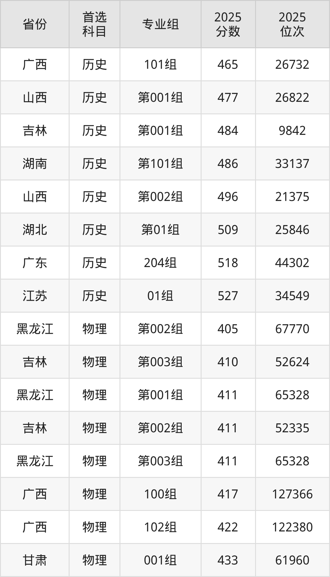 历史类最低分对应地区为广西(101组),录取位次为26732,超本科线63分;最高分对应地区为江苏(01组),录取位次为34549,超本科线45分。