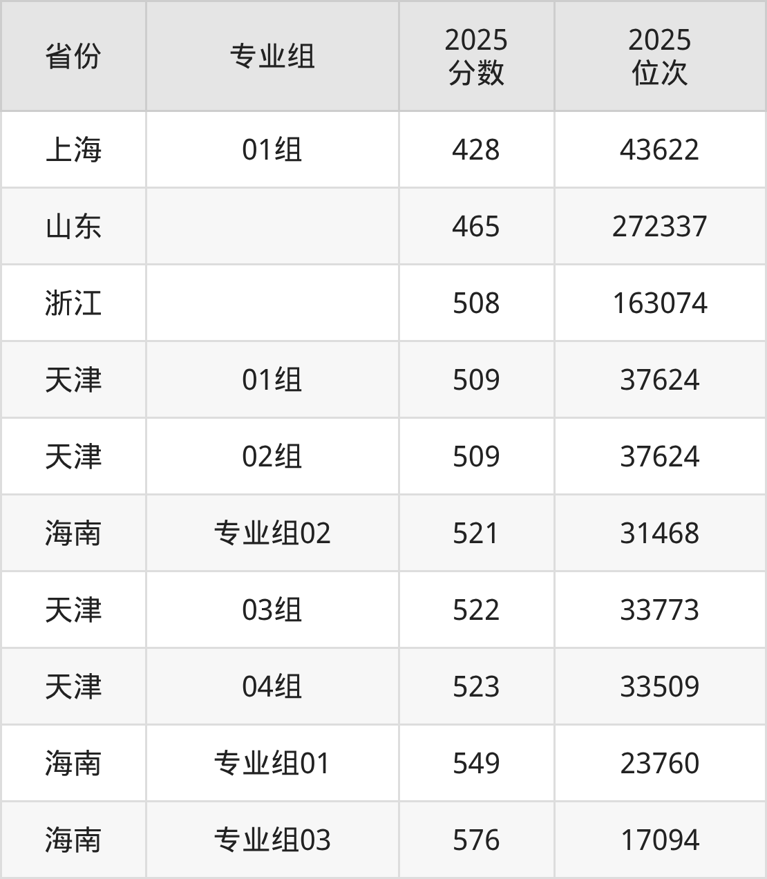 最低分对应地区为上海(01组),录取位次为43622,超本科线26分;最高分对应地区为海南(专业组03),录取位次为17094,超本科线96分。
