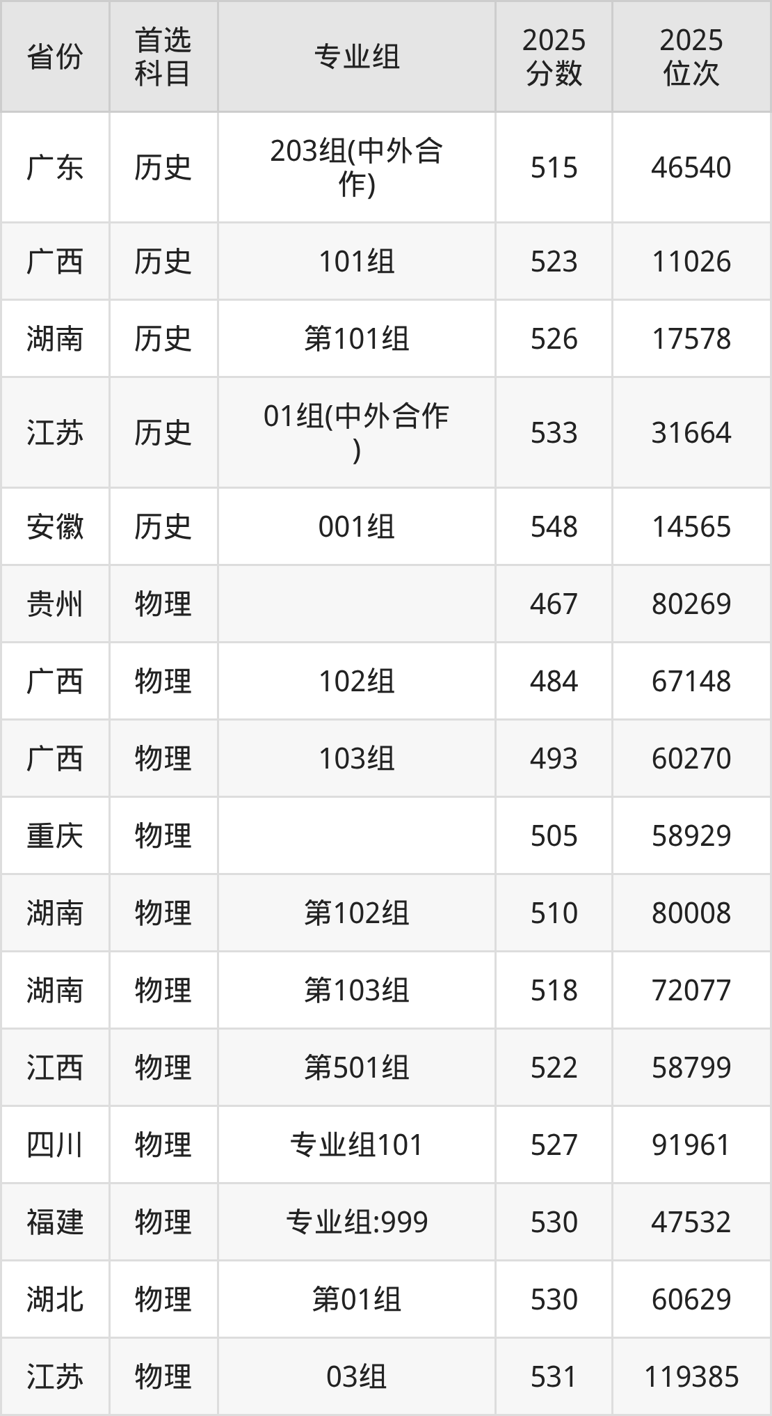 历史类最低分对应地区为广东(203组(中外合作)),录取位次为46540,超本科线51分;最高分对应地区为安徽(001组),录取位次为14565,超本科线71分。